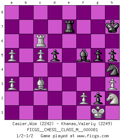 Last move : 1/2-1/2 2019 March 28 20:15:25 [Event "FICGS__CHESS__CLASS_M__000081"] [Site "FICGS"] [Date "2018.12.07"] [Round "1"] [White "Casier,Wim"] [Black "Khanas,Valeriy"] [Result "1/2-1/2"] [WhiteElo "2242"] [BlackElo "2249"] 1.e4 c5 2.Nf3 Nc6 3.Bb5 g6 4.Bxc6 bxc6 5.O-O Bg7 6.Re1 Nh6 7.c3 O-O 8.d4 cxd4 9.cxd4 d5 10.e5 f6 11.exf6 exf6 12.Nbd2 Bf5 13.Nb3 Re8 14.Rxe8+ Qxe8 15.Nc5 g5 16.Bd2 Bg6 17.Qa4 Nf5 18.Re1 Qc8 19.h3 Bf7 20.Nh2 h5 21.Nf1 Bf8 22.Ne3 Nh4 23.Rc1 Be8 24.Qd1 Bd6 25.a3 Bg6 26.Qe2 a5 27.Re1 Ra7 28.Bc3 Kh7 29.b4 f5 30.Nf1 f4 31.bxa5 Bxc5 32.dxc5 f3 33.Qe6 Qxe6 34.Rxe6 Bf5 35.Rxc6 fxg2 36.Nh2 Re7 1/2-1/2 Sicilian : Nimzovich-Rossolimo attack (with ...g6, without ...d6) Kingside Castling by player White (move 5) Kingside Castling by player Black (move 7) This chess game ended in a draw. Follow this game move after move (download)Becoming successful at Chess allows you to discover your own personality. That's what I want for the kids I teach. (Saudin Robovic) Ein Isolani verdüstert die Stimmung auf dem ganzen Schachbrett. (Savielly Grigorievitsch Tartakower) Una clavada es mas poderosa que una espada. (Fred Reinfeld) Dans le domaine de la peinture, de la gravure et de la sculpture, dès la première décennie de notre siècle, les artistes abandonnent la représentation de la partie d'échecs pour se concentrer sur les pièces, sur les échiquiers et sur toutes les variations auxquelles les unes et les autres peuvent donner lieu. On passe en quelque sorte d'un thème social à un thème musical (au sens de la musica médiévale, c'est-à-dire d'une notion qui inclue le rythme, l'harmonie, la construction et la déconstruction, etc.). Graphiquement et picturalement, l'échiquier apparaît comme une structure ouverte, dynamique, d'une richesse infinie, autorisant toutes les combinatoires et débouchant sur des mouvements et des rythmes de nature exponentielle. (Michel Pastoureau) When it is a question of money, everybody is of the same religion. (Voltaire)