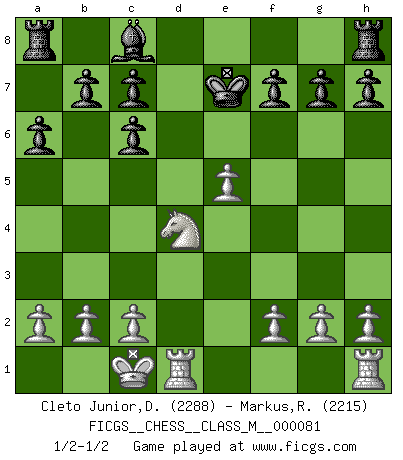 Last move : 1/2-1/2 2019 January 18 15:18:19 [Event "FICGS__CHESS__CLASS_M__000081"] [Site "FICGS"] [Date "2018.12.07"] [Round "1"] [White "Cleto Junior,Dirceu"] [Black "Markus,Roland"] [Result "1/2-1/2"] [WhiteElo "2288"] [BlackElo "2215"] 1.e4 e5 2.Nf3 Nc6 3.Bb5 Nf6 4.d4 exd4 5.e5 Ne4 6.Qe2 Bb4+ 7.Nbd2 a6 8.Bxc6 Nxd2 9.Bxd2 Bxd2+ 10.Qxd2 dxc6 11.Qxd4 Qxd4 12.Nxd4 Ke7 13.O-O-O 1/2-1/2 Ruy Lopez : Berlin defense Queenside Castling by player White (move 13) This chess game ended in a draw. Follow this game move after move (download)There are two classes of men; those who are content to yield to circumstances and who play whist; those who aim to control circumstances, and who play Chess. (Mortimer Collins) Was ist der Unterschied zwischen einem Strassenarbeiter und einem Schachspieler? --Der Schachspieler bewegt sich ab und zu. (Anonymous) Uno no tiene que jugar muy bien, es suficiente jugar mejor que el oponente. (Siegbert Tarrasch) Je ne suis pas le dernier à jouer lâchement des coups douteux pendant le zeïtnot de l'adversaire pour l'achever: en effet les coups qui font le plus peur sont ceux que l'on ne comprend pas. Je me fais souvent peur quand je joue. (Un professeur anonyme) Life is verb, not a noun. (Charlotte Perkins Gilman)