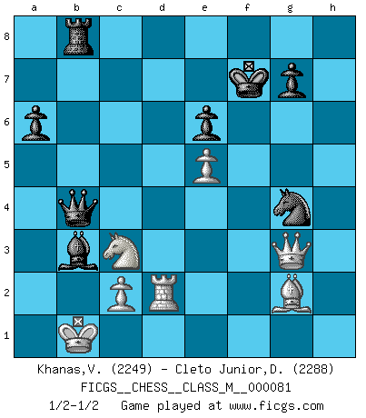 Last move : 1/2-1/2 2019 February 13 17:39:20 [Event "FICGS__CHESS__CLASS_M__000081"] [Site "FICGS"] [Date "2018.12.07"] [Round "1"] [White "Khanas,Valeriy"] [Black "Cleto Junior,Dirceu"] [Result "1/2-1/2"] [WhiteElo "2249"] [BlackElo "2288"] 1.e4 c5 2.Nf3 d6 3.d4 cxd4 4.Nxd4 Nf6 5.Nc3 e6 6.g4 h6 7.Rg1 Nc6 8.Be3 a6 9.h4 h5 10.gxh5 Nxh5 11.Qd2 Nxd4 12.Qxd4 Nf6 13.Bg5 Qa5 14.O-O-O Bd7 15.f4 Rc8 16.Rg2 Qc5 17.Qd3 Be7 18.Kb1 Bc6 19.a3 b5 20.Rgd2 O-O 21.Bg2 b4 22.axb4 Qxb4 23.e5 dxe5 24.fxe5 Rb8 25.b3 Rfd8 26.Qe3 Rxd2 27.Rxd2 Ng4 28.Qg3 Bxg5 29.hxg5 Ba4 30.g6 Bxb3 31.gxf7+ Kxf7 1/2-1/2 Sicilian : Scheveningen, Keres attack Queenside Castling by player White (move 14) Kingside Castling by player Black (move 20) This chess game ended in a draw. Follow this game move after move (download)As one by one I mowed them down, my superiority soon became apparent. (Jose Capablanca) Ein Buch ist ein Spiegel; wenn ein Affe hineinsieht, so kann kein Apostel heraus gucken. (Georg Christoph Lichtenberg) Cada Peón es una Reina en potencia. (James Mason) Comme les marins qui ont mille raisons différentes d'aller en mer, les joueurs d'échecs en ont tout autant avant de s'installer devant une table et jouer... (Vincent Bertignac, philosophe) Good decisions come from experience, and experience comes from bad decisions. (Anonymous)