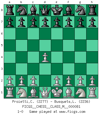 Last move : 1-0 2019 January 17 6:4:0 [Event "FICGS__CHESS__CLASS_M__000081"] [Site "FICGS"] [Date "2018.12.07"] [Round "1"] [White "Proietti,Costantino"] [Black "Busquets,Luis"] [Result "1-0"] [WhiteElo "2277"] [BlackElo "2236"] 1.d4 1-0 This chess game has been lost on time (started : 2018.12.07 20:48:49) Queen's pawn Player White won this chess game. Follow this game move after move (download)The older I grow, the more I value Pawns. (Keres) Die starken Figuren des Gegners muss man abtauschen. (José Raúl Capablanca) Robert Fischer es la ley hacia si mismo. (Larry Evans) Les pièces de l'échiquier étaient impitoyables. Elles le retenaient, elles l'absorbaient. Il y avait de l'horreur en cela, mais aussi une harmonie unique. Car, qu'y a-t-il dans le monde, à part les échecs ? (V. Nabokov) When you stop learning you start dying. (Scott Adams)