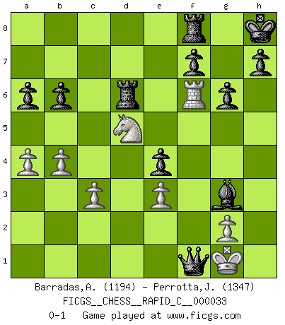 Last move : 0-1 2007 August 24 22:25:11 [Event "FICGS__CHESS__RAPID_C__000033"] [Site "FICGS"] [Date "2007.05.27"] [Round "1"] [White "Barradas,Anderson"] [Black "Perrotta,John Zach"] [Result "0-1"] [WhiteElo "1194"] [BlackElo "1347"] 1.e4 c5 2.Nf3 g6 3.d4 cxd4 4.Nxd4 Nc6 5.c3 Bg7 6.Be3 Nf6 7.e5 Nxe5 8.Be2 O-O 9.O-O d6 10.Nd2 Neg4 11.h3 Nxe3 12.fxe3 b6 13.Bf3 d5 14.Nc6 Qc7 15.Nd4 e5 16.Nb5 Qc5 17.Qe2 Ba6 18.a4 e4 19.Bg4 Nxg4 20.hxg4 Qe7 21.Nb3 Bxb5 22.Qxb5 Qg5 23.Rae1 Rad8 24.Nd4 Qxg4 25.Nc6 Rd6 26.Ne7+ Kh8 27.Nxd5 a6 28.Qc4 Be5 29.b4 Bg3 30.Rd1 Qh5 31.Rf6 Qxd1+ 32.Qf1 Qxf1+ 0-1 Sicilian : Hungarian variation Kingside Castling by player Black (move 8) Kingside Castling by player White (move 9) Player Black won this chess game. Follow this game move after move (download)Chess is the art of analysis. (Mikhail Botvinnik) Frage des Reporters: -Worin besteht das Ziel von Gambiteröffnungen? Antwort: -Auf Kosten der Partie einen Ruf als Angriffspieler zu erwerben.- (Siegbert Tarrasch) La captura del Rey enemigo es la finalidad pero no el primer objetivo de la partida. (William Steinitz) La guerre est enfant de la passion, la passion est enfant du narcissisme et le narcissisme est l'enfant. (...) Une autre partie ? (Thibault de Vassal) Perception is reality. (Immanuel Kant)