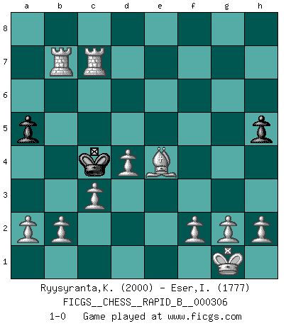 Last move : 1-0 2019 April 22 8:2:10 [Event "FICGS__CHESS__RAPID_B__000306"] [Site "FICGS"] [Date "2018.12.09"] [Round "1"] [White "Ryysyranta,Kaaleppi"] [Black "Eser,Ipekyilmaz"] [Result "1-0"] [WhiteElo "2000"] [BlackElo "1777"] 1.e4 f6 2.d4 e6 3.Bd3 d6 4.Nc3 f5 5.exf5 exf5 6.Nh3 Nf6 7.O-O c6 8.Re1+ Be7 9.Qe2 a6 10.Bg5 Kf7 11.Nf4 g6 12.Bc4+ d5 13.Ncxd5 cxd5 14.Nxd5 Ne4 15.Nxe7 Ke8 16.Nxf5 Qxg5 17.Qxe4+ Kd8 18.Qe5 Nd7 19.Qxh8+ Kc7 20.Ne7 Nb6 21.Re5 Bh3 22.Nd5+ Kc6 23.Rxg5 Rxh8 24.Nxb6 Bf5 25.Nd5 Kd6 26.Ne3 Bd7 27.Re5 h6 28.Re1 Rf8 29.Bd3 Rg8 30.Nc4+ Kc7 31.Re7 Rd8 32.Ne5 h5 33.Bxg6 Kd6 34.Nf7+ Kc7 35.Nxd8 Kxd8 36.Rh7 Kc7 37.R1e7 Kb6 38.Rxd7 Kc6 39.Be4+ Kb5 40.Rxb7+ Kc4 41.c3 a5 42.Rhc7+ 1-0 Barnes defense Kingside Castling by player White (move 7) Player White won this chess game. Follow this game move after move (download)The blunders are all there on the board, waiting to be made. (Savielly Tartakover) Intelligenz läßt sich nicht am Weg, sondern nur am Ergebnis feststellen. (Garry Kasparov) La maestría del Ajedrez consiste esencialmente en analizar posiciónes de Ajedrez con precisión. (Mikhail Botvinnik) La tactique est l'élément le plus important du milieu de jeu. (Siegbert Tarrasch) There is no instance of a country having benefited from prolonged warfare. (Sun Tzu)