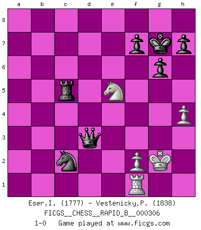 Last move : 1-0 2019 June 24 23:9:22 [Event "FICGS__CHESS__RAPID_B__000306"] [Site "FICGS"] [Date "2018.12.09"] [Round "1"] [White "Eser,Ipekyilmaz"] [Black "Vestenicky,Patrik"] [Result "1-0"] [WhiteElo "1777"] [BlackElo "1838"] 1.a3 Nf6 2.d3 d5 3.Bg5 e5 4.Bxf6 Qxf6 5.e3 Bd6 6.e4 c6 7.exd5 cxd5 8.g3 Nc6 9.Bg2 Be6 10.h3 Bc5 11.Qd2 Nd4 12.Nc3 Rc8 13.Bxd5 Bxd5 14.Nxd5 Qc6 15.Rh2 Qxd5 16.Kf1 Bd6 17.Rc1 Qa2 18.Qd1 Qxb2 19.Rb1 Qxa3 20.Ra1 Qc3 21.Rxa7 Nxc2 22.Rxb7 O-O 23.Nf3 e4 24.dxe4 Bxg3 25.Kg2 Bf4 26.Rh1 Qc6 27.Rd7 Qxe4 28.Rg1 Rc3 29.Rd8 g6 30.Rd7 Rfc8 31.Rf1 R8c5 32.Rd8+ Kg7 33.h4 Be5 34.Rd3 Rxd3 35.Qxd3 Qxd3 36.Nxe5 1-0 This chess game has been lost on time (started : 2018.12.09 22:50:2) Anderssen's Opening Kingside Castling by player Black (move 22) Player White won this chess game. Follow this game move after move (download)We must make sure that Chess will not be like a dead language, very interesting, but for a very small group. (Sytze Faber) Schach ist mein Leben, meine Leidenschaft, was ich gelernt habe und seit meinem 14. Lebensjahr profimässig praktiziere. Darauf zu verzichten, würde mir sehr schwer fallen. (Viktor Kortschnoi) Cuando le juegas a Fischer, no es una cuestion de si vas a ganar o perder. Es una cuestion de si vas a sobrevivir. (Boris Spassky) Les échecs c'est le défi de l'alpiniste, toujours plus haut, prêt à tout pour monter à l'assaut du Roi ennemi. Les échecs, c'est de la musique en mouvement, un ballet majestueux pour les yeux. C'est de la poésie composée par les fantômes du passé qui au même titre que Rimbaud ou Verlaine méritent notre admiration. Les échecs, c'est de la peinture ou le moindre mouvement modifie le tableau pour en faire un Picasso ou un Van Gogh. Les échecs, c'est tout et rien, c'est la vie et la mort. Jjulie33 sur le forum de France-Echecs. If we knew what we were doing, we would not call it research. (Albert Einstein)
