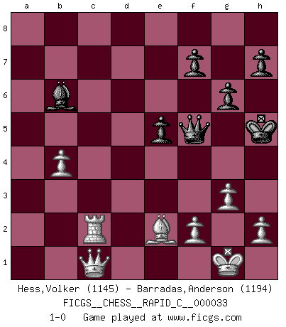 Last move : 1-0 2007 June 25 18:6:3 [Event "FICGS__CHESS__RAPID_C__000033"] [Site "FICGS"] [Date "2007.05.27"] [Round "1"] [White "Hess,Volker"] [Black "Barradas,Anderson"] [Result "1-0"] [WhiteElo "1145"] [BlackElo "1194"] 1.c4 Nf6 2.Nc3 g6 3.g3 Bg7 4.Bg2 O-O 5.d3 e6 6.Bg5 Re8 7.Nf3 c6 8.Bxf6 Bxf6 9.Rb1 d5 10.O-O a6 11.cxd5 cxd5 12.d4 Nc6 13.e3 b5 14.b4 Be7 15.a3 Rb8 16.Ne5 Nxe5 17.dxe5 Bb7 18.Ne2 a5 19.Nd4 axb4 20.axb4 Ba6 21.Nc6 Qc7 22.Nxb8 Rxb8 23.Qb3 Qxe5 24.Rfc1 Qf6 25.Bf1 d4 26.Rc6 Bc8 27.Rbc1 dxe3 28.Rxc8+ Rxc8 29.Rxc8+ Bd8 30.Qxe3 Kg7 31.Qc3 e5 32.Bxb5 Bb6 33.Qb2 Qf5 34.Rc2 Kh6 35.Qc1+ Kh5 36.Be2+ 1-0 English Opening Kingside Castling by player Black (move 4) Kingside Castling by player White (move 10) Player White won this chess game. Follow this game move after move (download)Chess is a foolish expedient for making idle people believe they are doing something very clever when they are only wasting their time. (George Bernard Shaw) Wer wird heute Abend ihr Gegner sein? -- Heute Abend spiele ich gegen die schwarzen Steine. (Akiba Rubinstein) El Ajedrez se juega con la mente... ¡no con las manos!. (Renaud y Kahn) Assurément je connaissais par expérience le mystérieux attrait de ce jeu royal, le seul entre tous les jeux inventés par les hommes qui échappe souverainement à la tyrannie du hasard, le seul où l'on ne doive sa victoire qu'à son intelligence ou plutôt à une certaine forme d'intelligence. Mais n'est-ce pas déjà le limiter injurieusement que d'appeler les échecs un jeu ? N'est-ce pas une science, un art ou quelque chose qui, comme le cercueil de Mahomet entre ciel et terre, est suspendu entre l'un et l'autre, et qui réunit un nombre incroyable de contraires ? [...] C'est une pensée qui ne mène à rien, une mathématique qui n'établit rien, un art qui ne laisse pas d'uvre, une architecture sans matière; et il l'a prouvé néanmoins qu'il était plus durable, à sa manière, que les livres ou que tout autre monument, ce jeu unique qui appartient à tous les peuples et à tous les temps, et dont personne ne sait quel dieu en fit don à la terre pour tuer l'ennui, pour aiguiser l'esprit et stimuler l'âme. Où commence-t-il, où finit-il ? (Stefan Zweig) Men should grow up. - Yeah. And dogs should stop licking themselves. It's not gonna happen. (Gregory House to Dr. Cameron, House M.D.)