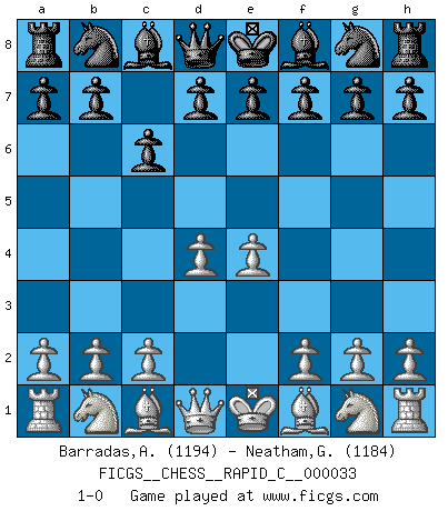 Last move : 1-0 2007 June 30 9:21:26 [Event "FICGS__CHESS__RAPID_C__000033"] [Site "FICGS"] [Date "2007.05.27"] [Round "1"] [White "Barradas,Anderson"] [Black "Neatham,Graeme"] [Result "1-0"] [WhiteElo "1194"] [BlackElo "1184"] 1.e4 c6 2.d4 1-0 This chess game has been lost on time (started : 2007.05.27 9:20:18) Caro-Kann defense Player White won this chess game. Follow this game move after move (download)Via the squares on the chessboard, the Indians explain the movement of time and the age, the higher influences which control the world and the ties which link Chess with the human soul. (Al-Masudi) Ein Teil des Fehlers ist immer korrekt. (Savielly Grigorievitsch Tartakower) Si el Ajedrez es una ciencia, es la mas inexacta. Si el Ajedrez es un arte, es demasiado inexacto para ser visto como tal. Si el Ajedrez es un deporte, es demasiado esotérico. Si el Ajedrez es un juego, es demasiado exigente para ser solo un juego. Si el Ajedrez es una aventura, es una muy demandante. Si el Ajedrez es una pasión, es una muy gratificante. Si el Ajedrez es la vida, es una muy triste. (Anónimo) Seul un grand joueur sait à quel point il joue faiblement. (Xavier Tartacover) The ego is not master in its own house. (Sigmund Freud)