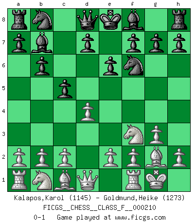 Last move : 0-1 2019 January 22 6:45:16 [Event "FICGS__CHESS__CLASS_F__000210"] [Site "FICGS"] [Date "2018.12.11"] [Round "1"] [White "Kalapos,Karol"] [Black "Goldmund,Heike"] [Result "0-1"] [WhiteElo "1145"] [BlackElo "1273"] 1.Nf3 Nf6 2.g3 b6 3.Bg2 Bb7 4.O-O e6 5.d4 c5 0-1 This chess game has been lost on time (started : 2018.12.11 7:37:10) Reti Opening Kingside Castling by player White (move 4) Player Black won this chess game. Follow this game move after move (download)I won't play with you anymore. You have insulted my friend. - When an opponent cursed himself for a blunder. (Miguel Najdorf) In Buenos Aires ist es nicht mein vorrangiges Ziel ein starkes Turnier zu organisieren, sondern ein Turnier für Gentlemen. Ich würde nie Kamsky einladen. Ich mag keine Probleme. (Miguel Najdorf) Si tu oponente no puede hacer nada activo, entonces no apures la posición; En vez de eso, dejalo estar sentado ahí, sufriendo y rogandote por un empate. (Jeremy Silman) Aux échecs, l'amour-propre est satisfait quand on remporte la victoire, mais il n'y a pas de honte à être battu. (Benjamin Franklin) You think that education is too expensive ? Try ignorance. (Derek Bok)