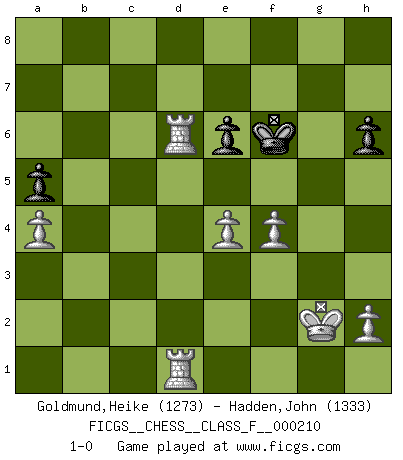 Last move : 1-0 2019 February 18 23:55:23 [Event "FICGS__CHESS__CLASS_F__000210"] [Site "FICGS"] [Date "2018.12.11"] [Round "1"] [White "Goldmund,Heike"] [Black "Hadden,John"] [Result "1-0"] [WhiteElo "1273"] [BlackElo "1333"] 1.e4 e5 2.Nf3 Nc6 3.Bc4 h6 4.c3 d6 5.O-O Nf6 6.d3 Be6 7.Bxe6 fxe6 8.b4 a6 9.Bb2 d5 10.a3 d4 11.cxd4 exd4 12.Nbd2 Qd7 13.Nb3 O-O-O 14.Qc2 g5 15.Nbxd4 Be7 16.Nxc6 Qxc6 17.Qxc6 bxc6 18.Rfd1 Rhf8 19.Ne5 Kb7 20.Ng6 Rf7 21.Nxe7 Rxe7 22.Bxf6 Red7 23.Bxd8 Rxd8 24.g3 Kb6 25.a4 c5 26.bxc5+ Kxc5 27.Rac1+ Kd6 28.f4 gxf4 29.gxf4 Rd7 30.Rc4 c5 31.d4 cxd4 32.Rcxd4+ Ke7 33.Rxd7+ Kf6 34.R7d6 a5 35.Kg2 1-0 King's pawn game Kingside Castling by player White (move 5) Queenside Castling by player Black (move 13) Player White won this chess game. Follow this game move after move (download)The isolated Pawn casts gloom over the entire chessboard. (Aaron Nimzovich) Du kannst im Schach nur gut werden, wenn du das Spiel liebst. (Robert James Fischer) Fischer era un maestro de claridad y un Rey del posicionamiento astuto. Sus oponentes podían ver hacia donde se dirigía pero eran impotentes para detenerlo. (Bruce Pandolfini) Le plus grand jeu de l'esprit jamais inventé, plus vous l'apprenez, plus vous y prenez du plaisir. (Garry Kasparov) Fame, I have already. Now I need the money. (an elderly Steinitz)