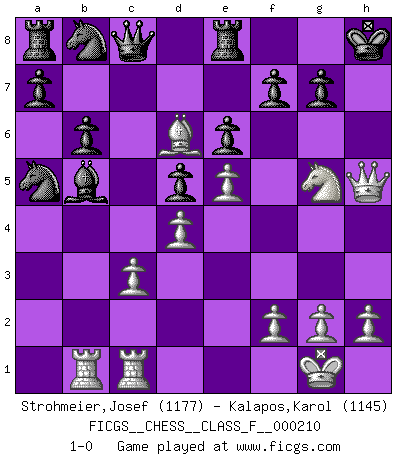 Last move : 1-0 2019 February 22 0:13:11 [Event "FICGS__CHESS__CLASS_F__000210"] [Site "FICGS"] [Date "2018.12.11"] [Round "1"] [White "Strohmeier,Josef"] [Black "Kalapos,Karol"] [Result "1-0"] [WhiteElo "1177"] [BlackElo "1145"] 1.e4 e6 2.d4 d5 3.Nc3 Bb4 4.e5 c5 5.a3 Bxc3+ 6.bxc3 Qa5 7.Bd2 cxd4 8.cxd4 Qb6 9.Nf3 Ne7 10.Rb1 Qd8 11.Bd3 O-O 12.O-O Nec6 13.c3 Qe7 14.a4 b6 15.Qc2 Bd7 16.Bxh7+ Kh8 17.Bd3 Na5 18.Bg5 Qa3 19.Bc1 Qxa4 20.Qe2 Qc6 21.Ba3 Rd8 22.Rfc1 Qa4 23.Be7 Re8 24.Bd6 Qc6 25.Bb5 Qc8 26.Ng5 Bxb5 27.Qh5+ 1-0 French : Winawer, Advance variation Kingside Castling by player Black (move 11) Kingside Castling by player White (move 12) Player White won this chess game. Follow this game move after move (download)An attack on the wing should be met by play in the center. (Nimzovitch) Ich bewundere Kasparows phantasievolle Angriffssiege aus den Achtzigern und Neunzigern, aber wenn man sie mit dem Computer überprüft, nimmt der Computer in jeder zweiten Partie die Opfer an, verteidigt sich und gewinnt. (Vladimir Kramnik) Las leyes del Ajedrez no permiten una libre elección: tienes que mover quieras o no. (Emanuel Lasker) Les Echecs sont affaire de jugement sensible. Savoir quand frapper et quand esquiver. (Fischer) Inventor: A person who makes an ingenious arrangement of wheels, levers and springs, and believes it civilization. (Ambrose Bierce, The Devil's Dictionary)