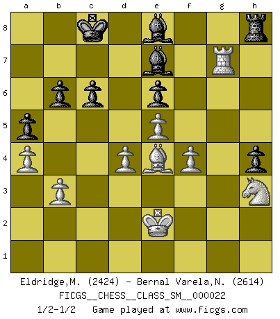 Last move : 1/2-1/2 2019 September 27 3:47:54 [Event "FICGS__CHESS__CLASS_SM__000022"] [Site "FICGS"] [Date "2018.12.14"] [Round "1"] [White "Eldridge,Mark"] [Black "Bernal Varela,Nelson"] [Result "1/2-1/2"] [WhiteElo "2424"] [BlackElo "2614"] 1.Nf3 e6 2.c4 f5 3.g3 g6 4.Bg2 Nf6 5.Nc3 Bg7 6.d4 O-O 7.O-O d6 8.Re1 d5 9.Bf4 c6 10.Rc1 h6 11.e3 Nbd7 12.Bd6 Rf7 13.Re2 Ne4 14.Be5 Bf8 15.Rec2 g5 16.a4 Nxc3 17.Rxc3 g4 18.Ne1 dxc4 19.Rxc4 Nxe5 20.dxe5 Qxd1 21.Rxd1 Rd7 22.Nd3 a5 23.Rd4 Rxd4 24.exd4 Kf7 25.h3 gxh3 26.Bxh3 Rb8 27.Bf1 b6 28.Be2 Bd7 29.Rc1 Rc8 30.Bh5+ Ke7 31.Be2 Kd8 32.Bd1 Be7 33.Kf1 Kc7 34.Bf3 Kb8 35.b3 Kb7 36.Ke2 Bg5 37.Rc2 Rd8 38.Rc4 Rh8 39.Bh5 Rf8 40.f4 Be7 41.g4 fxg4 42.Bxg4 Ba3 43.Rc2 Rg8 44.Nf2 Kc7 45.Bf3 Be7 46.Nd1 Kb7 47.Nf2 Rh8 48.Rc1 Be8 49.Rg1 Kc8 50.Bg4 Kd7 51.Bf3 Kc8 52.Bg4 Bf7 53.Rc1 Kc7 54.Bf3 Be8 55.Rb1 Kd8 56.Rc1 Kc7 57.Rh1 Kd7 58.Be4 h5 59.Rg1 Kc8 60.Nh3 h4 61.Rg7 1/2-1/2 Reti Opening Kingside Castling by player Black (move 6) Kingside Castling by player White (move 7) This chess game ended in a draw. Follow this game move after move (download)Not all artists are Chess players, but all Chess players are artists. (Marcel Duchamp) Ich spiele ehrlich und spiele, um zu gewinnen. Wenn ich verliere nehme ich meine Medizin. (Robert James Fischer) Los asuntos humanos son como una partida de Ajedrez: solo aquellos que no lo toman seriamente, pueden ser llamados buenos jugadores. (Hung Tzu Ch'eng) La menace est plus forte que l'exécution. (Aaron Nimzovitch) In God we trust, all others we virus scan. (Anonymous)