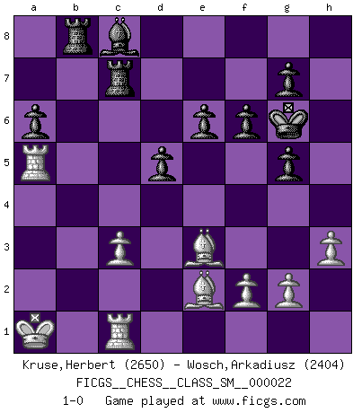 Last move : 1-0 2019 April 28 13:24:38 [Event "FICGS__CHESS__CLASS_SM__000022"] [Site "FICGS"] [Date "2018.12.14"] [Round "1"] [White "Kruse,Herbert"] [Black "Wosch,Arkadiusz"] [Result "1-0"] [WhiteElo "2650"] [BlackElo "2404"] 1.e4 c5 2.Nf3 Nc6 3.d4 cxd4 4.Nxd4 Nf6 5.Nc3 d6 6.Bg5 e6 7.Qd2 a6 8.Nxc6 bxc6 9.O-O-O h6 10.Bf4 d5 11.Qe3 Bb4 12.Be2 O-O 13.e5 Nd7 14.Qg3 Qc7 15.Na4 Re8 16.Bh5 Ra7 17.Rd3 Rb7 18.Re3 Kf8 19.c3 Nc5 20.cxb4 Nxa4 21.Rf3 Re7 22.Bd2 c5 23.Kb1 cxb4 24.Rc1 Qb8 25.Ka1 Rbc7 26.Rb1 Rb7 27.Be3 Qc7 28.Rc1 Nc3 29.Qg6 Kg8 30.Qg4 Qxe5 31.Bd4 Qg5 32.Qxg5 hxg5 33.bxc3 Rec7 34.Rd3 f6 35.Be3 b3 36.Rd2 bxa2 37.Rxa2 Rb8 38.Ra5 Kh7 39.Be2 Kg6 40.h3 1-0 Sicilian defense Queenside Castling by player White (move 9) Kingside Castling by player Black (move 12) Player White won this chess game. Follow this game move after move (download)Though most people love to look at the games of the great attacking masters, some of the most successful players in history have been the quiet positional players. They slowly grind you down by taking away your space, tying up your pieces, and leaving you with virtually nothing to do ! (Yasser Seirawan) Es genügt nicht ein guter Spieler zu sein, man muß auch gut spielen. (Siegbert Tarrasch) En la vida, como en el Ajedrez, los Peones propios obstruyen nuestro camino. La gran fortuna de un hombre, su comodidad, placer, hijos, libros, que deberían ayudarle a ganar, con mucha frecuencia lo ponen en Jaque Mate. (Charles Buxton) Echiquier : carré parfait, comme la Jérusalem nouvelle décrite par l'auteur de l'Apocalypse, huit cases sur huit, exaltation du chiffre 4, symbole du cosmos aux quatre horizons... où le noir et le blanc, l'ombre et la lumière, le mal et le bien s'entremêlent et se conjuguent. (Robert Couffignal, Le Gambit du poète) Tree pose grows confidence. It roots me to this world. (Terri Guillemets)
