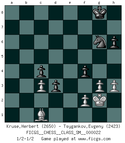 Last move : 1/2-1/2 2019 August 13 8:28:36 [Event "FICGS__CHESS__CLASS_SM__000022"] [Site "FICGS"] [Date "2018.12.14"] [Round "1"] [White "Kruse,Herbert"] [Black "Tsygankov,Evgeny"] [Result "1/2-1/2"] [WhiteElo "2650"] [BlackElo "2423"] 1.e4 e5 2.Nf3 Nc6 3.Bb5 a6 4.Ba4 Nf6 5.O-O Be7 6.Re1 b5 7.Bb3 O-O 8.d3 d6 9.a3 Na5 10.Ba2 c5 11.Nbd2 Rb8 12.c3 Nc6 13.h3 Be6 14.Bxe6 fxe6 15.b4 d5 16.Qe2 c4 17.dxc4 bxc4 18.Bb2 Re8 19.Nh2 a5 20.Ng4 Qc7 21.Red1 Red8 22.Re1 Re8 23.Red1 Red8 24.Rac1 Kh8 25.Nxf6 gxf6 26.Nf1 Bf8 27.Ne3 Qf7 28.exd5 exd5 29.Rc2 axb4 30.axb4 Ne7 31.Bc1 f5 32.Ra2 Ng6 33.Qh5 f4 34.Nf5 Rb6 35.Nh4 Bg7 36.b5 Qf6 37.Nf5 Ne7 38.Nh4 Ng6 39.Nf5 Ne7 40.Nxg7 Qxg7 41.Re2 Ng6 42.Qg5 R6b8 43.g3 h6 44.Qh5 Rxb5 45.Kh2 d4 46.Rxd4 exd4 47.Qxb5 d3 48.Re8+ Rxe8 49.Qxe8+ Qg8 50.Qxg8+ Kxg8 51.Kg2 1/2-1/2 Ruy Lopez : Closed, 7...O-O Kingside Castling by player White (move 5) Kingside Castling by player Black (move 7) This chess game ended in a draw. Follow this game move after move (download)Fischer prefers to enter Chess history alone. (Miguel Najdorf) Wenn es im Universum noch irgendwo intelligente Lebewesen gibt, dann kennen sie Go. (Emanuel Lasker) Las leyes del Ajedrez no permiten una libre elección: tienes que mover quieras o no. (Emanuel Lasker) Une platitude souvent récitée à propos des Echecs est qu'une des choses les plus difficiles à réaliser est de gagner une position gagnante. Cela ne manque pas de sens mais, pour ma part, j'ai toujours trouvé plus difficile de gagner une position perdante. (Tim Krabbe) Luck has a peculiar habit of favoring those who don't depend on it. (Author unknown)