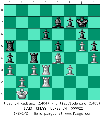Last move : 1/2-1/2 2019 April 14 16:8:57 [Event "FICGS__CHESS__CLASS_SM__000022"] [Site "FICGS"] [Date "2018.12.14"] [Round "1"] [White "Wosch,Arkadiusz"] [Black "Ortiz,Clodomiro"] [Result "1/2-1/2"] [WhiteElo "2404"] [BlackElo "2403"] 1.e4 c5 2.Nf3 d6 3.d4 cxd4 4.Nxd4 Nf6 5.Nc3 a6 6.Be3 e5 7.Nb3 Be6 8.f3 Nbd7 9.Qd2 b5 10.O-O-O Be7 11.g4 b4 12.Nd5 Bxd5 13.exd5 Nb6 14.Na5 Nbxd5 15.Nc6 Qc7 16.Nxb4 Rc8 17.Bd3 O-O 18.Nxd5 Nxd5 19.Be4 Nxe3 20.Qxe3 Rb8 21.Qd3 g6 22.h4 a5 23.Rd2 Kg7 24.c3 a4 25.g5 Rfc8 26.a3 Qc4 27.Qxc4 Rxc4 28.Rg1 h5 29.Kc2 Rbc8 30.Rd5 R4c5 31.R5d1 Ra5 32.Rd2 Rc4 33.Rgd1 Kf8 34.Kb1 Kg7 35.Kc1 R4c5 36.Kc2 Rc4 37.Rd3 Kf8 38.R3d2 Kg7 39.Rd3 Kf8 40.R1d2 Kg7 41.Kb1 Rac5 42.Rd1 Ra5 43.R1d2 1/2-1/2 Sicilian : Najdorf, Byrne (English) attack Queenside Castling by player White (move 10) Kingside Castling by player Black (move 17) This chess game ended in a draw. Follow this game move after move (download)Chess is really ninety nine percent calculation. (Soltis) Vom Schach wurde gesagt das Leben sei dafür nicht lange genug. Aber das ist der Fehler des Lebens, nicht des Schach'. (Irving Chernev) Aquellos que dicen que entienden al Ajedrez, no entienden nada. (Robert Hubner) Des idées, des idées, j'en ai cent, j'en ai mille. Des bonnes, des mauvaises, applicables, irréalisables... Il suffit de faire le tri ! (Roos) If you lose the game you should win the analysis! (Proverb)