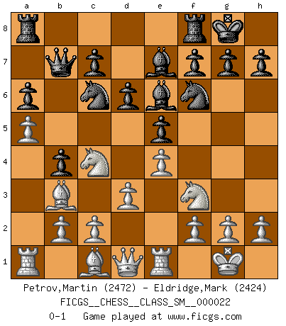 Last move : 0-1 2019 March 27 0:31:12 [Event "FICGS__CHESS__CLASS_SM__000022"] [Site "FICGS"] [Date "2018.12.14"] [Round "1"] [White "Petrov,Martin"] [Black "Eldridge,Mark"] [Result "0-1"] [WhiteElo "2472"] [BlackElo "2424"] 1.e4 e5 2.Nf3 Nc6 3.Bb5 a6 4.Ba4 Nf6 5.O-O Be7 6.d3 b5 7.Bb3 d6 8.a4 b4 9.a5 O-O 10.Nbd2 Be6 11.Nc4 Qc8 12.Re1 Qb7 0-1 This chess game has been lost on time (started : 2018.12.14 8:25:49) Ruy Lopez : Closed defense Kingside Castling by player White (move 5) Kingside Castling by player Black (move 9) Player Black won this chess game. Follow this game move after move (download)Some part of a mistake is always correct. (Savielly Tartakover) Die Auseinandersetzung mit Karpow war politisch geprägt. Er stand für das kommunistische System, wurde von dessen Repräsentanten gehätschelt. Ich war der Oppositionelle. Jeder Schachweltmeister spiegelt auch die gesellschaftlichen Verhältnisse wider. Kramnik steht für die Börsen-Generation des Neuen Markts, ideologiefrei, zahlenfixiert. (Garry Kasparov) Es el objetivo de la escuela moderna no tratar cada posición de acuerdo a una regla general, sino de acuerdo al principio inherente en la posición. (Richard Reti) C'est la seule position que je connaisse où les deux camps sont mals. Propos prêtés à V. Anand. 98% of all statistics are made up. (Author unknown)
