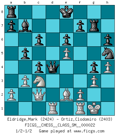 Last move : 1/2-1/2 2019 January 14 23:30:6 [Event "FICGS__CHESS__CLASS_SM__000022"] [Site "FICGS"] [Date "2018.12.14"] [Round "1"] [White "Eldridge,Mark"] [Black "Ortiz,Clodomiro"] [Result "1/2-1/2"] [WhiteElo "2424"] [BlackElo "2403"] 1.d4 Nf6 2.c4 e6 3.Nf3 d5 4.Nc3 c6 5.Bg5 h6 6.Bh4 dxc4 7.e4 g5 8.Bg3 b5 9.Be2 Bb7 10.h4 g4 11.Ne5 Nbd7 12.Nxd7 Qxd7 13.Be5 Qe7 14.O-O Rg8 15.b3 Bg7 16.Qc2 Nh5 17.Bxg7 Rxg7 18.g3 Qd6 19.e5 Qxd4 20.Rad1 1/2-1/2 Queen's pawn game Kingside Castling by player White (move 14) This chess game ended in a draw. Follow this game move after move (download)You need not play well - just help your opponent to play badly. (Genrikh Chepukaitis) Ich verstehe den Grund nicht, warum die Aufteilung in Frauen und Männer überhaupt im Schach besteht. (Judith Polgar) Cuando no sepas que mover, espera por una idea que se le venga a la la cabeza de tu oponente. Tenlo por seguro de que esa idea estará incorrecta. (Siegbert Tarrasch) Ce qui caractérise les parties de combat, c'est que si le défenseur a constamment de difficiles problèmes à résoudre, l'attaquant doit chercher sans relâche de nouvelles possibilités d'attaque. (Koblentz) It's unlucky to be superstitious. (Dave Enteles)