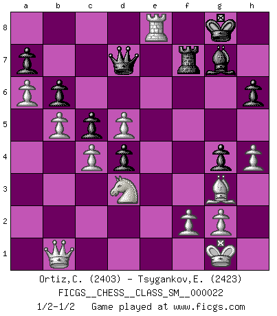 Last move : 1/2-1/2 2019 March 8 9:44:45 [Event "FICGS__CHESS__CLASS_SM__000022"] [Site "FICGS"] [Date "2018.12.14"] [Round "1"] [White "Ortiz,Clodomiro"] [Black "Tsygankov,Evgeny"] [Result "1/2-1/2"] [WhiteElo "2403"] [BlackElo "2423"] 1.d4 Nf6 2.c4 g6 3.Nc3 Bg7 4.e4 O-O 5.Bd3 d6 6.Nge2 Nc6 7.Bg5 h6 8.Bd2 e5 9.d5 Nd4 10.O-O c5 11.a4 Rb8 12.a5 Bd7 13.b4 b6 14.a6 Qe7 15.b5 Rbe8 16.Ra3 Nh5 17.Nxd4 exd4 18.Ne2 f5 19.exf5 Bxf5 20.Bxf5 Rxf5 21.Nc1 R5f8 22.Rf3 Nf6 23.Nd3 g5 24.h4 g4 25.Rg3 Qe2 26.Bf4 Rf7 27.Qb1 Nh5 28.Bxd6 Nxg3 29.Bxg3 Qe7 30.Re1 Qd7 31.Rxe8+ 1/2-1/2 King's Indian : 4.e4 Kingside Castling by player Black (move 4) Kingside Castling by player White (move 10) This chess game ended in a draw. Follow this game move after move (download)There's never before been a Chess player with such a thorough knowledge of the intricacies of the game and such an absolutely indomitable will to win. I think Bobby is the greatest player that ever lived. (Lisa Lane) Das ganze Leben mit einer Ehefrau ist wie ein Endspiel mit ungleichfarbigen Läufern. (Viktor Kortschnoi) Un juego de Ajedrez es un dialogo, una conversación entre un jugador y su oponente. Cada movimiento del oponente puede contener amenazas o tropiezos, pero un jugador no se puede defender de las amenazas o tomar ventaja de los tropiezos si es que no se pregunta a sí mismo: ¿Que es lo que mi oponente va a hacer después de cada movida?. (Bruce A. Moon) Il n'y a plus de joueurs du niveau de Jacob Murray dont la seule quête est le beau jeu, le plaisir de voir les pièces construire quelque chose. Sur 10 idées à la minute, 9 seront sans intérêt, la dernière s'avèrera géniale. (Christian Bauer) Never risk one's whole fortune unless supported by one's entire army. (Niccolo Machiavelli)