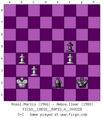 Last move : 0-1 2019 April 1 17:56:7 [Event "FICGS__CHESS__RAPID_A__000228"] [Site "FICGS"] [Date "2018.12.14"] [Round "1"] [White "Rossi,Marzio"] [Black "Ambos,Ilmar"] [Result "0-1"] [WhiteElo "1966"] [BlackElo "1980"] 1.e4 e6 2.d4 d5 3.Nc3 dxe4 4.Nxe4 Nd7 5.Nf3 Ngf6 6.Nxf6 Nxf6 7.Bd3 c5 8.O-O cxd4 9.Nxd4 Bc5 10.Nf3 O-O 11.Bg5 b6 12.Qe2 Bb7 13.Rad1 Qc7 14.Ne5 Rfd8 15.Rfe1 h6 16.Bxf6 gxf6 17.Ng4 Kg7 18.Ne3 f5 19.c3 Qf4 20.Nc4 Kf6 21.Ne3 Rg8 22.g3 Rad8 23.Kf1 Qc7 24.Bb5 Ba8 25.Qh5 Kg7 26.Rxd8 Rxd8 27.Rd1 Rxd1+ 28.Nxd1 Qb7 29.Ke2 a6 30.Bd3 Qh1 31.b4 Be7 32.Bxa6 Bc6 33.Bd3 Bg5 34.f4 Bd8 35.Ke3 b5 36.Qe2 Bb6+ 37.Kd2 Bf3 38.Qe1 Qxh2+ 39.Kc1 Qxa2 40.Qe5 Kg6 41.Nb2 Qa8 42.Bxb5 Bf2 43.g4 Bxg4 44.Nd3 Qa1+ 45.Kc2 Qd1+ 46.Kb2 Qd2+ 47.Ka3 Be3 48.Qh8 Qc2 49.Qg8 Kh5 50.Qg7 Be2 51.Qxf7 Kh4 52.Qf6 Kg3 53.Qg7 Kh2 54.Qxh6 Kg1 55.Qh3 Bc1+ 56.Nxc1 Qxc1+ 57.Ka4 Qa1+ 58.Kb3 Qd1+ 59.Kb2 Bxb5 60.Qe3 Kg2 61.Qxe6 Qe2+ 62.Qxe2 Bxe2 0-1 French : Rubinstein variation Kingside Castling by player White (move 8) Kingside Castling by player Black (move 10) 10 pieces endgame at move 59 : White KQPPP , Black KQBPP WHITE : King + 1 Queen 3 Pawns BLACK : King + 1 Queen 1 Bishop 2 Pawns 9 pieces endgame at move 61 : White KQPPP , Black KQBP WHITE : King + 1 Queen 3 Pawns BLACK : King + 1 Queen 1 Bishop 1 Pawn 8 pieces endgame at move 62 : White KQPPP , Black KBP WHITE : King + 1 Queen 3 Pawns BLACK : King + 1 Bishop 1 Pawn 7 pieces endgame at move 62 : White KPPP , Black KBP WHITE : King + 3 Pawns BLACK : King + 1 Bishop 1 Pawn Player Black won this chess game. Follow this game move after move (download)By the beauty of his games, the clarity of his play, and the brilliance of his ideas, Fischer made himself an artist of the same stature as Brahms, Rembrandt, and Shakespeare. (David Levy) Der vorletzte Fehler gewinnt. (Savielly Grigorievitsch Tartakower) El estómago es una parte esencial del maestro de Ajedrez. (Bent Larsen) Il vaut mieux sacrifier les pièces de l'adversaire. (Xavier Tartacover) I fear not the man who has practiced 10,000 kicks once, but I fear the man who has practiced one kick 10,000 times. (Bruce Lee)