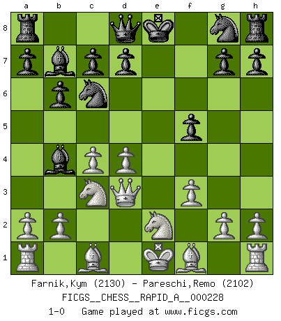 Last move : 1-0 2019 February 16 20:37:34 [Event "FICGS__CHESS__RAPID_A__000228"] [Site "FICGS"] [Date "2018.12.14"] [Round "1"] [White "Farnik,Kym"] [Black "Pareschi,Remo"] [Result "1-0"] [WhiteElo "2130"] [BlackElo "2102"] 1.c4 b6 2.Nc3 e6 3.e4 Bb7 4.d4 Bb4 5.f3 f5 6.exf5 exf5 7.Nge2 Nc6 8.Qd3 1-0 This chess game has been lost on time (started : 2018.12.14 12:5:53) English Opening Player White won this chess game. Follow this game move after move (download)A thorough understanding of the typical mating continuations makes the most complicated sacrificial combinations leading up to them not only not difficult, but almost a matter of course. (Siegbert Tarrasch) Die Partien sind immer verschieden, die Interviews immer die gleichen. (Garry Kasparov) El hombre es un frívolo, una creatura engañosa y como un jugador de Ajedrez, se preocupa mas por el proceso de obtener su meta que de la meta por sí misma. (Dostoyevsky) Les Echecs, c'est l'art de la guerre sans les charniers, c'est la résurrection des morts tombés au champ d'honneur, l'espoir perpétuel, la suprématie de l'intelligence sur la force, la culture de l'esprit. (F. Szpiner) You can't play chess if you're groggy from pills. (Anatoly Karpov)