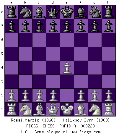 Last move : 1-0 2019 January 13 17:33:45 [Event "FICGS__CHESS__RAPID_A__000228"] [Site "FICGS"] [Date "2018.12.14"] [Round "1"] [White "Rossi,Marzio"] [Black "Kalixpov,Ivan"] [Result "1-0"] [WhiteElo "1966"] [BlackElo "1900"] 1.e4 1-0 This chess game has been lost on time (started : 2018.12.14 12:5:53) King's pawn Opening Player White won this chess game. Follow this game move after move (download)Discovered check is the dive bomber of the Chessboard. (Reuben Fine) Meine Liebe ist Schach, Schach, Schach. Ich muss jeden Tag Schach spielen, deshalb fühle ich mich so stark. (Miguel Najdorf) Yo creo que el Ajedrez posee una magia que es también una ayuda en la edad avanzada. Una rodilla reumática es olvidada durante una partida de Ajedrez y otros eventos pueden parecer algo sin importancia comparada a una catástrofe en el tablero de Ajedrez. (Vlastimil Hort) Toutes choses étant égales, c'est la conviction qui gagne. Alliée à une volonté de vaincre, elle sert de détonateur, suscite des idées, disperse les doutes et aide à penser clairement. (Robert Fischer) The Internet isn't free. It just has an economy that makes no sense to capitalism. (Brad Shapcott)
