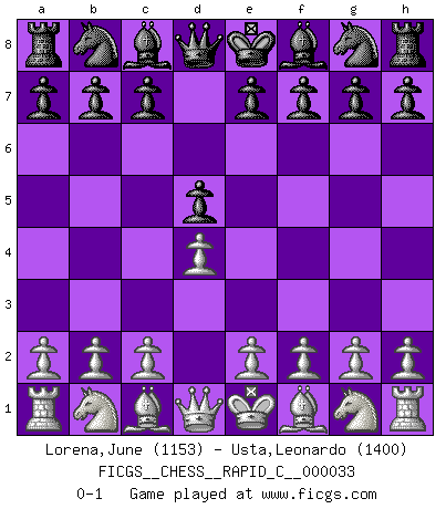 Last move : 0-1 2007 June 27 15:0:28 [Event "FICGS__CHESS__RAPID_C__000033"] [Site "FICGS"] [Date "2007.05.27"] [Round "1"] [White "Lorena,June"] [Black "Usta,Leonardo"] [Result "0-1"] [WhiteElo "1153"] [BlackElo "1400"] 1.d4 d5 0-1 This chess game has been lost on time (started : 2007.05.27 9:20:18) Queen's pawn game Player Black won this chess game. Follow this game move after move (download)I feel as if I were a piece in a game of Chess, when my opponent says of it: That piece cannot be moved. (Soren Kierkegaard) Schach ist das Spiel, das die Verrückten gesund hält. (Albert Einstein) El Peón aislado arroja penumbra sobre todo el tablero. (Aaron Nimzovich) À la honte des hommes, on sait que les lois du jeu sont les seules qui soient partout justes, claires, inviolables et exécutées. Pourquoi l'Indien qui a donné les règles du jeu d'échecs est-il obéi de bon gré dans toute la terre, et que les décrétales des papes, par exemple, sont aujourd'hui un objet d'horreur et de mépris ? C'est que l'inventeur des échecs combina tout avec justesse pour la satisfaction des joueurs, et que les papes, dans leurs décrétales, n'eurent en vue que leur seul avantage. L'Indien voulut exercer également l'esprit des hommes et leur donner du plaisir; les papes ont voulu abrutir l'esprit des hommes. Voltaire (Dictionnaire philosophique / Garnier 1967) . 'gn is not allowed in chess unless n is an integer between 1 and 8 inclusive, where 1 and 8 are to interpreted as the standard numerals standing for integers in the ordered real-closed field R, with the *canonical* ordering. (As opposed to, say, an integer in the domain Z[2+i*sqrt(5)] or an integer in some exotic Grothendieck topos). (Normajean Yates)