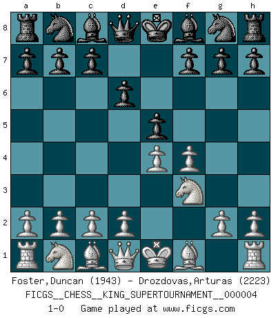 Last move : 1-0 2018 December 27 8:38:27 [Event "FICGS__CHESS__KING_SUPERTOURNAMENT__000004"] [Site "FICGS"] [Date "2018.12.16"] [Round "1"] [White "Foster,Duncan"] [Black "Drozdovas,Arturas"] [Result "1-0"] [WhiteElo "1943"] [BlackElo "2223"] 1.e4 e5 2.f4 d6 3.Nf3 1-0 King's gambit Player White won this chess game. Follow this game move after move (download)What would Chess be without silly mistakes ? (Kurt Richter) Ich würde die 30 stärksten Spieler der USA im Simultanspiel besiegen. (José Raúl Capablanca) Existen dos clases de sacrificios: los correctos y los míos. (Mikhail Tal) Le jeu d'échecs est comme rejeté hors du temps. (Antoine de Saint-Exupéry) Experiences are the keys to life. (Daniel Parmet)
