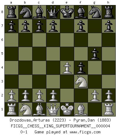 Last move : 0-1 2018 December 18 5:24:6 [Event "FICGS__CHESS__KING_SUPERTOURNAMENT__000004"] [Site "FICGS"] [Date "2018.12.16"] [Round "1"] [White "Drozdovas,Arturas"] [Black "Pyran,Dan"] [Result "0-1"] [WhiteElo "2223"] [BlackElo "1883"] 1.e4 e5 2.f4 exf4 3.Nf3 g5 0-1 King's knight's gambit Player Black won this chess game. Follow this game move after move (download)Chess is a fairy tale of 1001 blunders. (Savielly Tartakower) Schach ist Leben. (Robert James Fischer) Diferente gente reacciona diferentemente en aceptar la derrota. (Bobby Fischer) Mais n'est-ce pas déjà le limiter injurieusement que d'appeler les échecs un jeu? N'est-ce pas aussi une science, un art, ou quelque chose qui, comme le cercueil de Mahomet entre ciel et terre, est suspendu entre l'un et l'autre, et qui réunit un nombre incroyable de contraires ? (Stefan Zweig) The bottom line is always the bottom line. (Johann Piek)