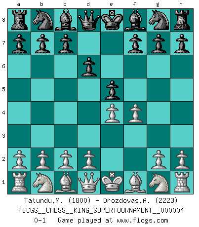 Last move : 0-1 2019 January 15 17:56:3 [Event "FICGS__CHESS__KING_SUPERTOURNAMENT__000004"] [Site "FICGS"] [Date "2018.12.16"] [Round "1"] [White "Tatundu,Martono"] [Black "Drozdovas,Arturas"] [Result "0-1"] [WhiteElo "1800"] [BlackElo "2223"] 1.e4 e5 2.f4 d6 0-1 This chess game has been lost on time (started : 2018.12.16 15:42:43) King's gambit Player Black won this chess game. Follow this game move after move (download)My style is somewhere between that of Tal and Petrosian. (Reshevsky) Alle Schachspieler sollten auch ein Hobby haben. (Savielly Grigorievitsch Tartakower) Tu cuerpo tiene que estar en óptima condición. Tu Ajedrez se deteriora como lo hace tu cuerpo. No puedes separar la mente y el cuerpo. (Bobby Fischer) Les ravages du H expliquent la différence de niveau entre Tal et Thal [Abergel]. Good decisions come from experience, and experience comes from bad decisions. (Anonymous)