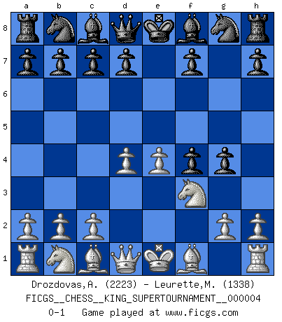 Last move : 0-1 2018 December 18 16:8:11 [Event "FICGS__CHESS__KING_SUPERTOURNAMENT__000004"] [Site "FICGS"] [Date "2018.12.16"] [Round "1"] [White "Drozdovas,Arturas"] [Black "Leurette,Marc-Antoine"] [Result "0-1"] [WhiteElo "2223"] [BlackElo "1338"] 1.e4 e5 2.f4 exf4 3.Nf3 g5 4.d4 g4 0-1 KGA : Rosentreter gambit Player Black won this chess game. Follow this game move after move (download)Methodical thinking is of more use in Chess than inspiration. (C. J. S. Purdy) Die westlichen Werte sind eine Sprache, welche die Putin-Administration nicht versteht. (Garry Kasparov) El jugador táctico sabe que hacer cuando hay algo que hacer; mientras que el estratega sabe que hacer cuando no hay nada que hacer. (Gerald Abrahams) Vouloir jouer aux échecs contre soi-même est aussi paradoxal que vouloir marcher sur son ombre. (Stefan Zweig) The only difference between a tax man and a taxidermist is that the taxidermist leaves the skin. (Mark Twain)