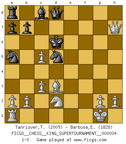 Last move : 1-0 2019 March 23 12:27:11 [Event "FICGS__CHESS__KING_SUPERTOURNAMENT__000004"] [Site "FICGS"] [Date "2018.12.16"] [Round "1"] [White "Tanriover,Taner"] [Black "Barbosa,Edinardo"] [Result "1-0"] [WhiteElo "2009"] [BlackElo "1828"] 1.e4 e5 2.f4 exf4 3.Nf3 g5 4.Bc4 g4 5.O-O gxf3 6.Qxf3 Bh6 7.d4 Nc6 8.c3 d6 9.Bxf4 Bxf4 10.Qxf4 f6 11.Qg3 Nge7 12.Qg7 Rf8 13.Rxf6 Rxf6 14.Qxf6 d5 15.exd5 Na5 16.Bb5+ c6 17.Bd3 Nxd5 18.Qh8+ Kd7 19.Qxh7+ Kd6 20.Nd2 c5 21.dxc5+ 1-0 KGA : Muzio gambit Kingside Castling by player White (move 5) Player White won this chess game. Follow this game move after move (download)If your opponent offers you a draw, try to work out why he thinks he's worse off. (Nigel Short) Um sich vor der Gefahr einer Erkältung zu schützen, sorge der wanderlustige König beizeiten für ein brauchbares Versteck. (Aaron Nimzowitsch) Del Ajedrez se ha dicho que la vida no es lo suficientemente larga para él, pero eso es culpa de la vida, no del Ajedrez. (William Ewart Napier) Aucun coup ne doit être joué sans but. (Pedro Damiano) A good aphorism is too hard for the tooth of time, and is not worn away with the centuries, although it serves as food for every speech. (Friedrich Nietzsche)