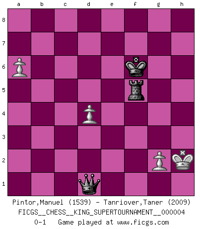 Last move : 0-1 2019 April 14 18:40:58 [Event "FICGS__CHESS__KING_SUPERTOURNAMENT__000004"] [Site "FICGS"] [Date "2018.12.16"] [Round "1"] [White "Pintor,Manuel"] [Black "Tanriover,Taner"] [Result "0-1"] [WhiteElo "1539"] [BlackElo "2009"] 1.e4 e5 2.f4 exf4 3.Nf3 d6 4.d4 Nf6 5.Nc3 Be7 6.Bc4 Nxe4 7.Bxf7+ Kxf7 8.Nxe4 Bf5 9.Nf2 Re8 10.O-O g5 11.c3 Kg7 12.Qb3 Nd7 13.Qxb7 Nb6 14.Qa6 Qd7 15.h3 h5 16.Nh2 Rh8 17.Qb7 g4 18.hxg4 hxg4 19.Bxf4 Rab8 20.Qa6 Nd5 21.Bg3 Ne3 22.b3 Nxf1 23.Nxf1 Qb5 24.Qxa7 Qc6 25.Qa5 Rb5 26.Qa4 Ra8 27.Qc4 Qxc4 28.bxc4 Rba5 29.Ne3 Bg5 30.Nxf5+ Rxf5 31.Nxg4 Ra3 32.c5 Rxc3 33.Bh2 dxc5 34.Bxc7 c4 35.a4 Rd3 36.Be5+ Kg6 37.a5 c3 38.a6 c2 39.Nf6 Rd1+ 40.Rxd1 cxd1Q+ 41.Kh2 Bxf6 42.Bxf6 Kxf6 0-1 KGA : Fischer defense Kingside Castling by player White (move 10) Promotion Queen by player Black (move 40) 10 pieces endgame at move 40 : White KBNPPP , Black KQRB WHITE : King + 1 Bishop 1 Knight 3 Pawns BLACK : King + 1 Queen 1 Rook 1 Bishop 9 pieces endgame at move 41 : White KBPPP , Black KQRB WHITE : King + 1 Bishop 3 Pawns BLACK : King + 1 Queen 1 Rook 1 Bishop 8 pieces endgame at move 42 : White KBPPP , Black KQR WHITE : King + 1 Bishop 3 Pawns BLACK : King + 1 Queen 1 Rook 7 pieces endgame at move 42 : White KPPP , Black KQR WHITE : King + 3 Pawns BLACK : King + 1 Queen 1 Rook Player Black won this chess game. Follow this game move after move (download)Bobby Fischer's current state of mind is indeed a tragedy. One of the world's greatest Chess players - the pride and sorrow of American Chess. (Frank Brady) Strategie ist, wie man ein Mädchen auf den Rücksitz bekommt. Taktik ist, was man tut, wenn man dann dort ist. (Anonymous) Una de estas pequeñas movidas modestas pudieran ser mas molestas a tu oponente que la amenaza mas grande. (Siegbert Tarrasch) Nous vivons dans un monde échiquéen : chaque jour qui passe est un défi à relever. (Philosophe Sasha) The man who strikes first admits that his ideas have given out. (Chinese proverb)