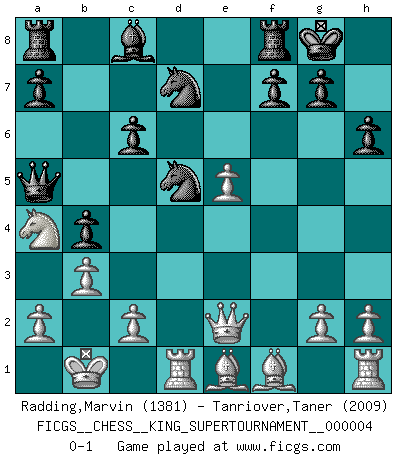 Last move : 0-1 2019 April 13 16:48:7 [Event "FICGS__CHESS__KING_SUPERTOURNAMENT__000004"] [Site "FICGS"] [Date "2018.12.16"] [Round "1"] [White "Radding,Marvin"] [Black "Tanriover,Taner"] [Result "0-1"] [WhiteElo "1381"] [BlackElo "2009"] 1.e4 e5 2.f4 exf4 3.Nf3 d6 4.d4 Nf6 5.Nc3 Be7 6.Bxf4 O-O 7.Qd2 c6 8.O-O-O b5 9.e5 dxe5 10.Nxe5 b4 11.Na4 Qa5 12.b3 Nd5 13.Bg3 h6 14.Kb1 Bg5 15.Qe2 Bf6 16.Be1 Bxe5 17.dxe5 Nd7 0-1 This chess game has been lost on time (started : 2018.12.16 15:42:43) KGA : Fischer defense Kingside Castling by player Black (move 6) Queenside Castling by player White (move 8) Player Black won this chess game. Follow this game move after move (download)The Pin is mightier than the sword. (Fred Reinfeld) Auf Remis zu spielen ist gewissermaßen ein Verbrechen gegen das Schachspiel. (Mikhail Nekhemyevich Tal) a manera como él juega al Ajedrez, demuestra la completa naturaleza de un hombre. (Stanley Ellin) La vie et les Echecs sont tous les deux une lutte constante. (Lasker) Good luck. You're gonna need it. (Han Solo in Star Wars ep.6)