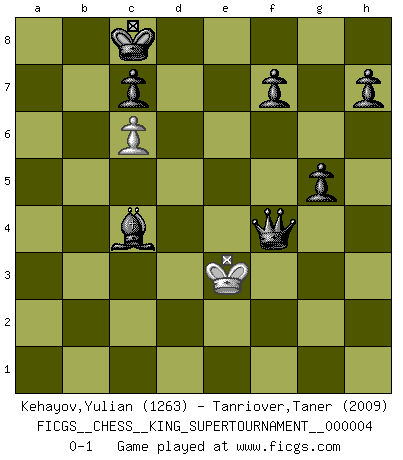 Last move : 0-1 2019 May 13 7:12:52 [Event "FICGS__CHESS__KING_SUPERTOURNAMENT__000004"] [Site "FICGS"] [Date "2018.12.16"] [Round "1"] [White "Kehayov,Yulian"] [Black "Tanriover,Taner"] [Result "0-1"] [WhiteElo "1263"] [BlackElo "2009"] 1.e4 e5 2.f4 d6 3.fxe5 Qh4+ 4.g3 Qxe4+ 5.Qe2 Qxh1 6.Qg2 Qxg2 7.Bxg2 Nc6 8.Nc3 Bf5 9.d3 O-O-O 10.exd6 Bxd6 11.Bd2 Nf6 12.O-O-O Rhe8 13.Re1 Rxe1+ 14.Bxe1 Re8 15.Bd2 Ng4 16.h3 Ne3 17.Bxe3 Rxe3 18.Kd2 Rxg3 19.Bxc6 bxc6 20.Nce2 Rg2 21.c4 Bh2 22.Nf3 Bxh3 23.Nxh2 Rxh2 24.Ke1 Bg4 25.Ng3 Rxb2 26.Ne4 Rxa2 27.Nf2 Rxf2 28.Kxf2 a5 29.Kg3 Be2 30.d4 Bxc4 31.Kf4 a4 32.Ke3 a3 33.d5 a2 34.dxc6 a1Q 35.Ke4 Qf6 36.Ke3 Qh4 37.Kf3 g5 38.Ke3 Qf4+ 0-1 King's gambit Queenside Castling by player Black (move 9) Queenside Castling by player White (move 12) 10 pieces endgame at move 30 : White KP , Black KBPPPPPP WHITE : King + 1 Pawn BLACK : King + 1 Bishop 6 Pawns 9 pieces endgame at move 34 : White KP , Black KBPPPPP WHITE : King + 1 Pawn BLACK : King + 1 Bishop 5 Pawns Promotion Queen by player Black (move 34) Player Black won this chess game. Follow this game move after move (download)I play correspondence chess because it is both art and science while chess is art only. (A player at FICGS) Ich brauche nur einen Blick auf das Schachbrett zu werfen, und weiß schon, was in der Stellung steckt, was geschehen kann und was geschehen wird. Alle übrigen suchen und prüfen, ich aber weiß es! (José Raúl Capablanca) Una partida de Ajedrez se divide en 3 etapas: la primera cuando piensas que tienes la ventaja, la segunda cuando crees que tienes la ventaja y la tercera... ¡cuando te das cuenta que vas a perder!. (Savielly Tartakower) Il vaut toujours mieux jouer un plan faux de façon logique que de n'avoir pas de plan du tout. (Victor Kortchnoï) There are two major products that came out of Berkeley: LSD and UNIX. We do not believe this is to be a coincidence. (Jeremy S. Anderson)