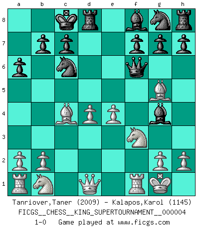 Last move : 1-0 2019 March 19 18:25:23 [Event "FICGS__CHESS__KING_SUPERTOURNAMENT__000004"] [Site "FICGS"] [Date "2018.12.16"] [Round "1"] [White "Tanriover,Taner"] [Black "Kalapos,Karol"] [Result "1-0"] [WhiteElo "2009"] [BlackElo "1145"] 1.e4 e5 2.f4 d6 3.Nf3 Nc6 4.Bc4 Bg4 5.c3 a6 6.d4 Qf6 7.fxe5 dxe5 8.O-O exd4 9.cxd4 O-O-O 10.Bg5 1-0 King's gambit Kingside Castling by player White (move 8) Queenside Castling by player Black (move 9) Player White won this chess game. Follow this game move after move (download)Fischer is an American Chess tragedy on par with Morphy and Pillsbury. (Mig Greengard) Gegen einen Schachcomputer zu verlieren ist wie Löcher in den Strümpfen zuhaben. Es ist nicht peinlich, solange man der einzige ist der es weiß. (Anonymous) Debemos de asegurarnos de que el Ajedrez no se convierta en un lenguaje muerto, muy interesante, pero tan solo para un grupo muy pequeño. (Sytze Faber) 'L'échange des dames est un coup dur pour les deux adversaires...' Un journaliste lors d'une partie du match Spassky-Fischer Who needs drugs and alcohol if he can play Big Chess at FICGS ? (Heinz-Georg Lehnhoff)
