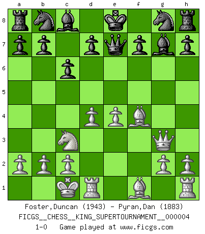Last move : 1-0 2019 February 3 19:21:2 [Event "FICGS__CHESS__KING_SUPERTOURNAMENT__000004"] [Site "FICGS"] [Date "2018.12.16"] [Round "1"] [White "Foster,Duncan"] [Black "Pyran,Dan"] [Result "1-0"] [WhiteElo "1943"] [BlackElo "1883"] 1.e4 e5 2.f4 exf4 3.Nf3 g5 4.d4 g4 5.Bxf4 gxf3 6.Qxf3 Qe7 7.Nc3 c6 8.O-O-O Bg7 9.Qg3 1-0 This chess game has been lost on time (started : 2018.12.16 15:42:43) KGA : Rosentreter gambit Queenside Castling by player White (move 8) Player White won this chess game. Follow this game move after move (download)It is no time to be playing Chess when the house is on fire. (Italian Proverb) Schach ist ein schwarz-weisser Dschungel. (Garry Kasparov) Yo he agregado estos principios a la ley: pongan los Caballos en acción antes de que los dos Alfiles sean desarrollados. (Emanuel Lasker) Ce n'est pas pour s'amuser qu'il joue aux échecs : il célèbre un culte. (Vladimir Nabokov) At last I discovered the true beauty of chess. So I proposed to her. (Dinesh De Silva)