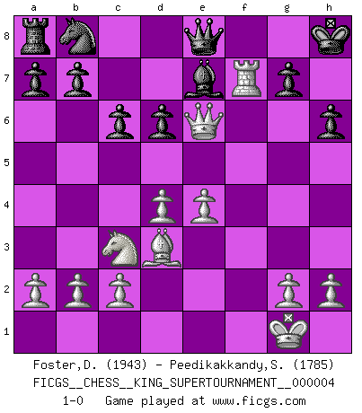 Last move : 1-0 2019 January 31 11:34:21 [Event "FICGS__CHESS__KING_SUPERTOURNAMENT__000004"] [Site "FICGS"] [Date "2018.12.16"] [Round "1"] [White "Foster,Duncan"] [Black "Peedikakkandy,Sameer"] [Result "1-0"] [WhiteElo "1943"] [BlackElo "1785"] 1.e4 e5 2.f4 d6 3.Nf3 exf4 4.d4 Nf6 5.Nc3 c6 6.Bxf4 Be7 7.Bd3 O-O 8.O-O Be6 9.Qe1 Re8 10.Ng5 h6 11.Nxe6 fxe6 12.Qg3 Nh5 13.Qg6 Nxf4 14.Rxf4 Rf8 15.Qxe6+ Kh8 16.Rxf8+ Qxf8 17.Rf1 Qe8 18.Rf7 1-0 King's gambit Kingside Castling by player Black (move 7) Kingside Castling by player White (move 8) Player White won this chess game. Follow this game move after move (download)My opponents make good moves too. Sometimes I don't take these things into consideration. (Bobby Fischer) Mit sehr nachdenklichem Gesicht schreitet Bobby durch den Turniersaal. Was ist passiert?, fragt Lombardy. Ich stehe schlecht, antwortet Fischer. Lombardy: Dann biete doch einfach Remis an. Fischer: So schlecht stehe ich nun auch wieder nicht! (Robert James Fischer) Con el tiempo, empecé a progresar en partidas decisivas. Tal vez porque me di cuenta de una simple verdad: no solo estaba yo nervioso sino también mi oponente. (Mikhail Tal) La vie est comme un jeu d'échecs : nous esquissons un plan, mais celui-ci est tributaire de ce que daignent faire l'adversaire aux échecs et le destin dans la vie. (Arthur Schopenhauer) No, I am still playing. (Anatoly Karpov)