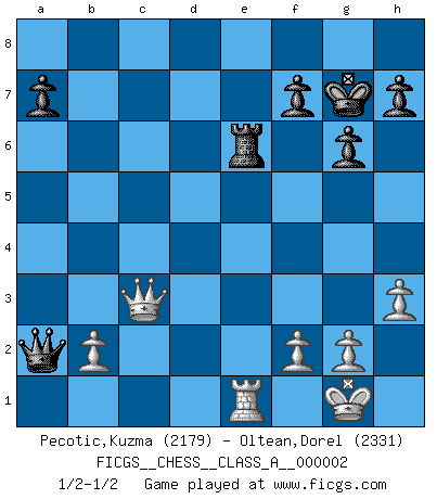 Last move : 1/2-1/2 2006 August 8 14:18:9 [Event "FICGS__CHESS__CLASS_A__000002"] [Site "FICGS"] [Date "2006.04.10"] [Round "1"] [White "Pecotic,Kuzma"] [Black "Oltean,Dorel"] [Result "1/2-1/2"] [WhiteElo "2179"] [BlackElo "2331"] 1.d4 Nf6 2.c4 e6 3.Nf3 c5 4.d5 exd5 5.cxd5 d6 6.e4 g6 7.Nc3 Bg7 8.Bd3 O-O 9.h3 b5 10.Bxb5 Nxe4 11.Nxe4 Qa5+ 12.Nfd2 Qxb5 13.Nxd6 Qa6 14.N2c4 Rd8 15.Bf4 Nd7 16.O-O Nb6 17.Nxb6 Qxb6 18.Nxc8 Raxc8 19.Rb1 Qb7 20.d6 Bf8 21.Qd2 Bxd6 22.Bxd6 Rc6 23.Rfd1 Qa6 24.Qg5 R8xd6 25.Rxd6 Rxd6 26.Qxc5 Qxa2 27.Re1 Re6 28.Qc8+ Kg7 29.Qc3+ 1/2-1/2 Queen's pawn game Kingside Castling by player Black (move 8) Kingside Castling by player White (move 16) This chess game ended in a draw. Follow this game move after move (download)No Chess Grandmaster is normal; they only differ in the extent of their madness. (Viktor Korchnoi) Ich verlor meine Bürgerrechte, mein Gehalt wurde mir nicht mehr bezahlt und ich wurde zensiert und durfte nicht mehr ins Ausland reisen. [nach dem Match Fischer-Taimanov 6:0] (Mark Taimanov) El Ajedrez es un juego terrible. Si no dominas el centro, tu oponente tiene una posición mas libre. Si tu tienes el centro, entonces realmente tienes algo de que preocuparte. (Siegbert Tarrasch) Avec des compensations pour le matériel en plus... (Anonyme) Over-the-board chess is the favorite of mortals, correspondence chess is the favorite of the gods. (Eduard Dyckhoff)