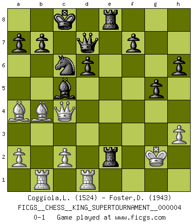 Last move : 0-1 2019 January 29 0:10:26 [Event "FICGS__CHESS__KING_SUPERTOURNAMENT__000004"] [Site "FICGS"] [Date "2018.12.16"] [Round "1"] [White "Coggiola,Leandro Damian"] [Black "Foster,Duncan"] [Result "0-1"] [WhiteElo "1524"] [BlackElo "1943"] 1.e4 e5 2.f4 exf4 3.Nf3 g5 4.Bc4 Bg7 5.O-O h6 6.d4 d6 7.Nc3 Ne7 8.Bd2 Nbc6 9.Qe2 Bg4 10.Qf2 Bxf3 11.Qxf3 Bxd4+ 12.Kh1 Ne5 13.Qe2 Qd7 14.Bb5 c6 15.Ba4 O-O-O 16.Nd5 Bxb2 17.Rab1 Bd4 18.Ba5 Nxd5 19.exd5 Rde8 20.dxc6 Nxc6 21.Qc4 Bc5 22.Rfd1 Re6 23.Bc3 Rhe8 24.h3 f3 25.Bb4 fxg2+ 26.Kxg2 Re2+ 0-1 KGA : Hanstein gambit Kingside Castling by player White (move 5) Queenside Castling by player Black (move 15) Player Black won this chess game. Follow this game move after move (download)After a bad opening, there is hope for the middle game. After a bad middle game, there is hope for the endgame. But once you are in the endgame, the moment of truth has arrived. (Edmar Mednis) Die westlichen Werte sind eine Sprache, welche die Putin-Administration nicht versteht. (Garry Kasparov) El Ajedrez se juega con la mente... ¡no con las manos!. (Renaud y Kahn) On peut tirer plus d'utilité d'une partie perdue que de 100 parties gagnées. (Capablanca) I don't diet. I just don't eat as much as I'd like to. (Linda Evangelista, supermodel)