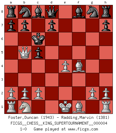 Last move : 1-0 2019 January 16 17:5:15 [Event "FICGS__CHESS__KING_SUPERTOURNAMENT__000004"] [Site "FICGS"] [Date "2018.12.16"] [Round "1"] [White "Foster,Duncan"] [Black "Radding,Marvin"] [Result "1-0"] [WhiteElo "1943"] [BlackElo "1381"] 1.e4 e5 2.f4 exf4 3.Nf3 Nc6 4.d4 g5 5.d5 Nb8 6.Qd4 f6 7.Nxg5 c5 8.Qd1 fxg5 9.Qh5+ Ke7 10.Qxg5+ Ke8 11.Qh5+ Ke7 12.d6+ Kxd6 13.Bxf4+ Kc6 14.Qd5+ Kb6 15.Qb3+ Kc6 16.Qb5+ 1-0 King's knight's gambit Player White won this chess game. Follow this game move after move (download)He who fears an isolated Queen's Pawn should give up Chess. (Siegbert Tarrasch) Es tut gut, die Entwicklungsperiode von, [...] demokratischem Geist durchdringen zu lassen. Wie undemokratisch wäre es doch beispielsweise, den einen Offizier große Spaziertouren vornehmen zu lassen, während die anderen zu Hause säßen und sich entsetzlich langweilten. (Aaron Nimzowitsch) El Ajedrez moderno está demasiado preocupado con cosas como la estructura de Peones. Olvidenlo, el Jaque Mate termina la partida. (Nigel Short) Que feriez-vous si vous étiez en train de jouer aux échecs et que la fin du monde arrive ? Je continuerais à jouer. (Saint Borromée) Indecision is the key to flexibility. (Unknown)