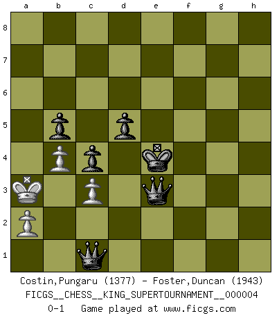 Last move : 0-1 2019 April 17 18:44:14 [Event "FICGS__CHESS__KING_SUPERTOURNAMENT__000004"] [Site "FICGS"] [Date "2018.12.16"] [Round "1"] [White "Costin,Pungaru"] [Black "Foster,Duncan"] [Result "0-1"] [WhiteElo "1377"] [BlackElo "1943"] 1.e4 e5 2.f4 exf4 3.Nf3 g5 4.d4 d6 5.Qe2 g4 6.Ng1 Bg7 7.c3 Qh4+ 8.Qf2 Qe7 9.Bxf4 Qxe4+ 10.Qe3 Qxe3+ 11.Bxe3 Nf6 12.Na3 a6 13.O-O-O O-O 14.h3 Nd5 15.Bd2 Nc6 16.Bd3 Re8 17.Nc2 h5 18.hxg4 hxg4 19.Ne2 Bd7 20.Rdf1 b5 21.Ng3 Nce7 22.Ne3 Nxe3 23.Bxe3 Nd5 24.Bh7+ Kf8 25.Bg5 Ne3 26.Bxe3 Rxe3 27.Nf5 Re2 28.Nxg7 Kxg7 29.g3 Rh8 30.Bc2 Rxh1 31.Rxh1 Rg2 32.Rh5 Rxg3 33.Rh7+ Kf6 34.Bb3 Be6 35.Bxe6 Kxe6 36.d5+ Kf6 37.Kc2 Rh3 38.Rxh3 gxh3 39.Kb3 h2 40.Kb4 h1Q 41.Ka5 Qxd5 42.Kxa6 Qc6+ 43.Ka5 Qb6+ 44.Kb4 c5+ 45.Kb3 c4+ 46.Kb4 d5 47.b3 Ke5 48.Ka3 f5 49.Kb2 f4 50.Kc2 f3 51.Kd2 Ke4 52.b4 Qe3+ 53.Kc2 f2 54.Kb2 f1Q 55.Ka3 Qf1c1+ 0-1 KGA : Rosentreter gambit Queenside Castling by player White (move 13) Kingside Castling by player Black (move 13) Promotion Queen by player Black (move 40) 10 pieces endgame at move 42 : White KPPP , Black KQPPPP WHITE : King + 3 Pawns BLACK : King + 1 Queen 4 Pawns Promotion Queen by player Black (move 54) Player Black won this chess game. Follow this game move after move (download)Chess is a terrific way for kids to build self image and self esteem. (Saudin Robovic) Wer mein Gambit spielt, muß bereit sein, alle Brücken hinter sich abzubrechen. Es verändert den ganzen Menschen. Es wirkt wie ein Zauberstab und fördert verkümmerte, gute Charakter- eigenschaften wieder zu Tage. (Emil Joseph Diemer) Yo siempre he tenido un ligero sentimiento de lástima por una persona que no tiene conocimiento del Ajedrez. (Siegbert Tarrasch) Des points faibles ou des trous dans la position de l'adversaire doivent être occupés par des pièces et non pas par des pions. (Siegbert Tarrasch) Every man's memory is his private literature. (Aldous Huxley)