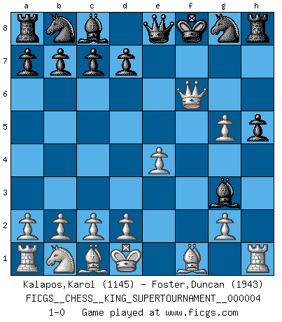 Last move : 1-0 2019 January 26 0:30:12 [Event "FICGS__CHESS__KING_SUPERTOURNAMENT__000004"] [Site "FICGS"] [Date "2018.12.16"] [Round "1"] [White "Kalapos,Karol"] [Black "Foster,Duncan"] [Result "1-0"] [WhiteElo "1145"] [BlackElo "1943"] 1.e4 e5 2.f4 exf4 3.Nf3 g5 4.h4 g4 5.Ng5 f6 6.Qxg4 h5 7.Qxf4 Bd6 8.Qf5 Bg3+ 9.Kd1 fxg5 10.Qg6+ Kf8 11.hxg5 Qe8 12.Qf6+ 1-0 KGA : Allgaier gambit Player White won this chess game. Follow this game move after move (download)What is the object of playing a gambit opening?... To acquire a reputation of being a dashing player at the cost of losing a game. (Siegbert Tarrasch) Ich suche im Schach immer etwas Eigenes. Riskantes Spiel im Stile schachlicher Musketiere ist nicht meine Sache, auch wenn es vielen Freunden scharfer Wendungen gefällt. (Anatoly Karpov) ¿Que sería del Ajedrez sin errores graciosos?. (Kurt Richter) Le profane ne songe pas à la somme de jouissance dont il se prive, qui méconnaît ce jeu aux ressources aussi variées que passionnantes. (Jean-Marie Jeanton-Lamarche) Luck is the residue of design. (John Milton)