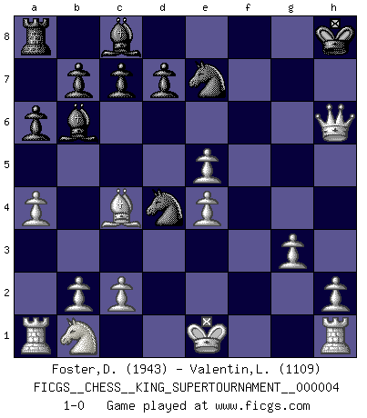 Last move : 1-0 2019 January 29 14:4:58 [Event "FICGS__CHESS__KING_SUPERTOURNAMENT__000004"] [Site "FICGS"] [Date "2018.12.16"] [Round "1"] [White "Foster,Duncan"] [Black "Valentin,Laurentiu"] [Result "1-0"] [WhiteElo "1943"] [BlackElo "1109"] 1.e4 e5 2.f4 Qh4+ 3.g3 Qd8 4.fxe5 Bc5 5.d4 Bb6 6.Nf3 Ne7 7.a4 a6 8.Bc4 O-O 9.Ng5 Nbc6 10.Qh5 h6 11.Nxf7 Qe8 12.Nd6 Kh7 13.Nxe8 Nxd4 14.Nf6+ Kh8 15.Bxh6 Rxf6 16.Bg5 Rh6 17.Bxh6 gxh6 18.Qxh6+ 1-0 King's gambit Kingside Castling by player Black (move 8) Player White won this chess game. Follow this game move after move (download)A thorough understanding of the typical mating continuations makes the most complicated sacrificial combinations leading up to them not only not difficult, but almost a matter of course. (Siegbert Tarrasch) Der Partner hat auch seine Existenzberechtigung. (Savielly Grigorievitsch Tartakower) Alguna parte de un error es siempre correcto. (Savielly Tartakover) Même un GMI sait rarement calculer sur plus de cinq coups une attaque à sacrifices. (Rudolf Spielmann) Luck never made a man wise. (Seneca, Letters to Lucilius)