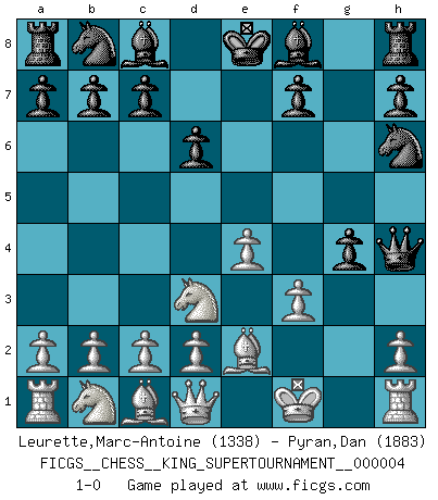 Last move : 1-0 2019 January 24 18:55:49 [Event "FICGS__CHESS__KING_SUPERTOURNAMENT__000004"] [Site "FICGS"] [Date "2018.12.16"] [Round "1"] [White "Leurette,Marc-Antoine"] [Black "Pyran,Dan"] [Result "1-0"] [WhiteElo "1338"] [BlackElo "1883"] 1.e4 e5 2.f4 exf4 3.Nf3 g5 4.Bc4 g4 5.Ne5 Qh4+ 6.Kf1 Nh6 7.Be2 d6 8.Nd3 f3 9.gxf3 1-0 This chess game has been lost on time (started : 2018.12.16 15:42:43) KGA : Salvio gambit Player White won this chess game. Follow this game move after move (download)Chess is imagination. (David Bronstein) Ich möchte Schüler heranbilden, die das Vermögen haben, selbst zu denken und Kritik zu üben. (Emanuel Lasker) Repentinamente, me resultaba obvio en mi analisis que yo había pasado por alto lo que Fischer había visto en el tablero con la mas grande facilidad. (Mikhail Botvinnik) Roi des jeux et jeu des rois, les échecs portent en eux un sentiment d'infini. Ils donnent à celui qui s'est efforcé d'en approfondir les arcanes l'impression de n'être pas à la mesure de l'homme; en fait, ils constituent un résumé de l'univers, un microcosme, et figurent cette grande échelle qui, dans les plans de la lumière descend jusqu'à la matière, qui des abîmes insondables remonte jusqu'en l'infini de Dieu. (Pyrame) You must have a dream in order to have it come true. (A.P.J. Kalam)