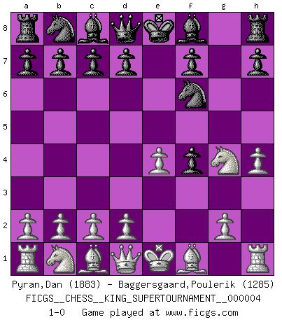 Last move : 1-0 2019 February 18 8:39:2 [Event "FICGS__CHESS__KING_SUPERTOURNAMENT__000004"] [Site "FICGS"] [Date "2018.12.16"] [Round "1"] [White "Pyran,Dan"] [Black "Baggersgaard,Poulerik"] [Result "1-0"] [WhiteElo "1883"] [BlackElo "1285"] 1.e4 e5 2.f4 exf4 3.Nf3 g5 4.h4 g4 5.Ne5 Nf6 6.Nxg4 1-0 This chess game has been lost on time (started : 2018.12.16 15:42:43) KGA : Kieseritsky, Berlin defense Player White won this chess game. Follow this game move after move (download)The older I grow, the more I value Pawns. (Keres) Ich spiele 70 Eröffnungssysteme. (Viktor Kortschnoi) Robert Fischer es la ley hacia si mismo. (Larry Evans) Vous n'êtes pas toujours obligé de jouer le meilleur coup. Un coup doit être actif, entreprenant, correct et beau ! (David Bronstein) Nothing is more important for teaching us to understand the concepts we have than constructing fictitious ones. (Ludwig Wittgenstein)