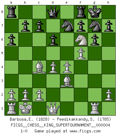 Last move : 1-0 2019 January 28 10:56:41 [Event "FICGS__CHESS__KING_SUPERTOURNAMENT__000004"] [Site "FICGS"] [Date "2018.12.16"] [Round "1"] [White "Barbosa,Edinardo"] [Black "Peedikakkandy,Sameer"] [Result "1-0"] [WhiteElo "1828"] [BlackElo "1785"] 1.e4 e5 2.f4 exf4 3.Nf3 d6 4.d4 Bg4 5.Bxf4 Nc6 6.Bc4 Bxf3 7.gxf3 Nf6 8.Nc3 Be7 9.Rg1 Nh5 10.Be3 Bh4+ 11.Kd2 Bf6 12.Kc1 g6 13.Kb1 a6 14.Nd5 O-O 15.f4 Ng7 16.f5 Ne7 17.Nxf6+ 1-0 KGA : Fischer defense Kingside Castling by player Black (move 14) Player White won this chess game. Follow this game move after move (download)During a Chess competition a Chessmaster should be a combination of a beast of prey and a monk. (Alexander Alekhine) Offensichtlich kennt Kasparow nichts anderes als Schach, und ich könnte 500 weitere Spieler dieser Sorte benennen. (Judith Polgar) Fischer deseaba darle a los Rusos una sopa de su propia medicina. (Larry Evans) Donnez-moi un Cavalier en 6e et je gagnerais toutes mes parties. (Steinitz) Hold em is to stud what chess is to checkers. (Johnny Moss)