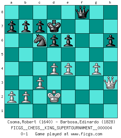 Last move : 0-1 2019 January 5 15:0:41 [Event "FICGS__CHESS__KING_SUPERTOURNAMENT__000004"] [Site "FICGS"] [Date "2018.12.16"] [Round "1"] [White "Csoma,Robert"] [Black "Barbosa,Edinardo"] [Result "0-1"] [WhiteElo "1640"] [BlackElo "1828"] 1.e4 e5 2.f4 exf4 3.Nf3 g5 4.h4 g4 5.Ne5 d6 6.Nxg4 Be7 7.Bc4 Bxh4+ 8.Kf1 Be6 9.Bxe6 fxe6 10.d4 Bg5 11.Qf3 Nf6 12.Bxf4 Nxg4 13.Qxg4 Bxf4 14.Qh5+ Kd7 15.Ke2 Qf6 16.c3 Qg7 17.g4 Bg5 18.Nd2 Nc6 19.Nf3 h6 20.Raf1 Raf8 21.Qh3 Rf4 22.Nd2 Rxf1 23.Rxf1 Bxd2 24.Kxd2 Rf8 25.Rxf8 Qxf8 0-1 KGA : Kieseritsky, Kolisch defense Player Black won this chess game. Follow this game move after move (download)In Chess, just as in life, today's bliss may be tomorrow's poison. (Assaic) Der Bart als Geschlechtszeichen mitten im Gesicht ist obszön. Daher gefällt er den Weibern. [Zugegeben, kein Schachzitat, aber unglaublich originell] (Arthur Schopenhauer) Algunos sacrificios son sólidos, los demás son míos. (Mikhail Tal) Les Echecs ont trois composantes : le temps, l'espace et le matériel en dernier. (Mikhail Tal) Luck never made a man wise. (Seneca, Letters to Lucilius)