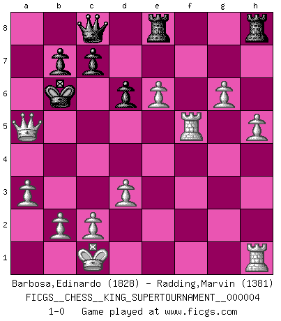 Last move : 1-0 2019 March 6 15:45:39 [Event "FICGS__CHESS__KING_SUPERTOURNAMENT__000004"] [Site "FICGS"] [Date "2018.12.16"] [Round "1"] [White "Barbosa,Edinardo"] [Black "Radding,Marvin"] [Result "1-0"] [WhiteElo "1828"] [BlackElo "1381"] 1.e4 e5 2.f4 exf4 3.Nf3 g5 4.h4 g4 5.Ne5 d6 6.Nxg4 Nf6 7.Nxf6+ Qxf6 8.d3 h5 9.Nc3 Be6 10.Be2 Nc6 11.Bxh5 O-O-O 12.Bd2 Ne5 13.Qe2 Bh6 14.O-O-O Rdg8 15.Qf2 Bg4 16.Nd5 Qd8 17.Bxg4+ Nxg4 18.Qxa7 Kd7 19.Rdf1 Ne3 20.Nxe3 fxe3 21.Bxe3 Bxe3+ 22.Qxe3 Qa8 23.a3 Qa4 24.Rxf7+ Kc6 25.Qf3 Kb6 26.g4 Qe8 27.h5 Qc8 28.g5 Kc6 29.g6 Rf8 30.e5 Kc5 31.Qe3+ Kb5 32.e6 Re8 33.Rf5+ Kc6 34.Qe4+ Kb6 35.Qb4+ Ka7 36.Qa4+ Kb6 37.Qa5+ 1-0 KGA : Kieseritsky, Kolisch defense Queenside Castling by player Black (move 11) Queenside Castling by player White (move 14) Player White won this chess game. Follow this game move after move (download)When in doubt... play Chess ! (Tevis) Gewinnen beim Schach fördert das Selbstvertrauen. Beim Sex spüre ich sowas nicht... (Garry Kasparov) Solo puedes ser bueno en el Ajedrez si amas al juego. (Bobby Fischer) La vérité est comme le meilleur coup aux échecs : elle existe, mais il faut la chercher. (Arturo Perez-Reverte) Life is pain my dear and anyone who says otherwise is selling something. (Princess Bride)