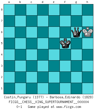 Last move : 0-1 2019 April 10 11:10:32 [Event "FICGS__CHESS__KING_SUPERTOURNAMENT__000004"] [Site "FICGS"] [Date "2018.12.16"] [Round "1"] [White "Costin,Pungaru"] [Black "Barbosa,Edinardo"] [Result "0-1"] [WhiteElo "1377"] [BlackElo "1828"] 1.e4 e5 2.f4 exf4 3.d4 Qh4+ 4.Ke2 Nf6 5.Nf3 Qh5 6.Bxf4 Qb5+ 7.Qd3 Qxb2 8.Qc3 Qxc3 9.Nxc3 Bb4 10.Nb5 Kd8 11.Ng5 Rf8 12.Bxc7+ Ke7 13.e5 Ne8 14.c3 Na6 15.cxb4 Naxc7 16.Nxc7 Nxc7 17.Nxh7 Rh8 18.Ng5 b6 19.h4 Nd5 20.a3 Bb7 21.Nf3 Rac8 22.Kf2 Rc2+ 23.Kg3 Ne3 24.Ne1 Rd2 25.Nf3 Bxf3 26.gxf3 Rxd4 27.f4 Nd5 28.Bh3 Nxf4 29.Rad1 Rxd1 30.Rxd1 Nxh3 31.Kxh3 Rh5 32.Rd5 Ke6 33.Rd6+ Ke7 34.Rd5 Rf5 35.Kg4 g6 36.a4 Kd8 37.Rb5 Kc7 38.a5 Kc6 39.axb6 axb6 40.Rxb6+ Kxb6 41.h5 Rxh5 42.Kf4 Kb5 43.Ke4 Kxb4 44.Kd5 Rxe5+ 45.Kxe5 f5 46.Kd6 f4 47.Kxd7 f3 48.Ke6 f2 49.Kf6 f1Q+ 50.Kxg6 Kc5 51.Kg5 Kd5 52.Kg4 Ke4 53.Kg5 Qf5+ 54.Kh6 Qg4 55.Kh7 Kf5 56.Kh6 Qg6+ 0-1 KGA : Villemson (Steinitz) gambit 10 pieces endgame at move 40 : White KRPPP , Black KRPPP WHITE : King + 1 Rook 3 Pawns BLACK : King + 1 Rook 3 Pawns 9 pieces endgame at move 40 : White KPPP , Black KRPPP WHITE : King + 3 Pawns BLACK : King + 1 Rook 3 Pawns 8 pieces endgame at move 41 : White KPP , Black KRPPP WHITE : King + 2 Pawns BLACK : King + 1 Rook 3 Pawns 7 pieces endgame at move 43 : White KP , Black KRPPP WHITE : King + 1 Pawn BLACK : King + 1 Rook 3 Pawns 6 pieces endgame at move 44 : White K , Black KRPPP WHITE : King + BLACK : King + 1 Rook 3 Pawns 5 pieces endgame at move 45 : White K , Black KPPP WHITE : King + BLACK : King + 3 Pawns 4 pieces endgame at move 47 : White K , Black KPP WHITE : King + BLACK : King + 2 Pawns Promotion Queen by player Black (move 49) 3 pieces endgame at move 50 : White K , Black KQ WHITE : King + BLACK : King + 1 Queen Player Black won this chess game. Follow this game move after move (download)Chess is like life. (Boris Spassky) Wie, soll nun auch die Opposition abgeschafft werden? Ja, es tut mir leid, Ihnen diesen Schmerz nicht ersparen zu können. (Aaron Nimzowitsch) No hay precio que sea tan grande por la cabellera del Rey enemigo. (Koblentz) Nous sommes les pions de la mystérieuse partie d'Echecs jouée par Dieu. Il nous déplace, nous arrête, nous pousse encore, puis nous lance un à un dans la boîte du Néant. Epitaphe sur la tombe de David Janowsky (1868-1927). Methinks King Thibault should dub Marius Zubac a knight of the square board... I mean table, henceforth addressing him as Sir Marius, and bestow on him a suitable land from the kingdom of FICGS & marry him off to a worthy, fair maiden, lest he slice our heads with his mighty sword in his wrath. (Dinesh De Silva)