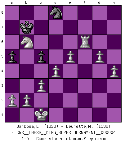 Last move : 1-0 2019 January 28 8:16:25 [Event "FICGS__CHESS__KING_SUPERTOURNAMENT__000004"] [Site "FICGS"] [Date "2018.12.16"] [Round "1"] [White "Barbosa,Edinardo"] [Black "Leurette,Marc-Antoine"] [Result "1-0"] [WhiteElo "1828"] [BlackElo "1338"] 1.e4 e5 2.f4 exf4 3.Nf3 g5 4.h4 g4 5.Ne5 d6 6.Nxg4 h5 7.Nf2 Nc6 8.d4 Bg4 9.Nxg4 hxg4 10.Qxg4 Bh6 11.c3 Nf6 12.Qf3 Qe7 13.Bd3 d5 14.e5 Ne4 15.Bxe4 dxe4 16.Qxe4 O-O-O 17.Bxf4 Bxf4 18.Qxf4 f6 19.Qxf6 Qh7 20.Nd2 Rhf8 21.Qe6+ Kb8 22.O-O-O Rde8 23.Qh3 b6 24.Rhf1 a5 25.Rxf8 Rxf8 26.Rf1 Re8 27.g4 Kb7 28.Rf6 Nd8 29.g5 c5 30.Nc4 Qc7 31.Nd6+ Ka6 32.Nxe8 Qb7 33.Nd6 Qb8 34.Qc8+ Qxc8 35.Nxc8 Kb7 36.Nxb6 1-0 KGA : Kieseritsky, Kolisch defense Queenside Castling by player Black (move 16) Queenside Castling by player White (move 22) Player White won this chess game. Follow this game move after move (download)Chess is war over the board. The object is to crush the opponents mind. (Bobby Fischer) Stelle das Brett so, daß die Sonne in die Augen deines Gegners scheint. (Ruy López) La batalla por la última verdad nunca sera ganada. Y es por eso que el Ajedrez es tan fascinante. (Hans Kmoch) En blitz, le Cavalier l'emporte sur le Fou. (Vlastimil Hort) A clear conscience is usually the sign of a bad memory. (Unknown)
