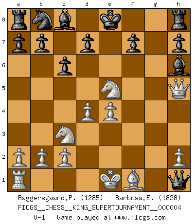 Last move : 0-1 2019 February 5 7:28:19 [Event "FICGS__CHESS__KING_SUPERTOURNAMENT__000004"] [Site "FICGS"] [Date "2018.12.16"] [Round "1"] [White "Baggersgaard,Poulerik"] [Black "Barbosa,Edinardo"] [Result "0-1"] [WhiteElo "1285"] [BlackElo "1828"] 1.e4 e5 2.f4 exf4 3.Nf3 g5 4.Nc3 g4 5.Ne5 Qh4+ 6.g3 fxg3 7.Qxg4 g2 8.Qxh4 gxh1Q 9.Qh5 Nh6 10.d4 c6 11.Bxh6 Bxh6 0-1 This chess game has been lost on time (started : 2018.12.16 15:42:43) KGA : Quaade gambit Promotion Queen by player Black (move 8) Player Black won this chess game. Follow this game move after move (download)The only thing Chess players have in common is Chess. (Lodewijk Prins) Je mehr wir mit Computern analysieren, desto mehr glauben wir an Verteidigung. (Vladimir Kramnik) Un entendimiento a fondo de las continuaciones típicas del mate, hace de las combinaciones de sacrificio mas complicadas conducirlas a ellas no solo sin dificultad, sino casi de una manera natural. (Siegbert Tarrasch) Je ne suis pas le dernier à jouer lâchement des coups douteux pendant le zeïtnot de l'adversaire pour l'achever: en effet les coups qui font le plus peur sont ceux que l'on ne comprend pas. Je me fais souvent peur quand je joue. (Un professeur anonyme) Chess is everything: art, science and sport. (Anatoly Karpov)