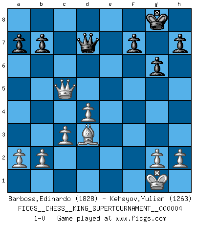 Last move : 1-0 2019 February 24 21:17:54 [Event "FICGS__CHESS__KING_SUPERTOURNAMENT__000004"] [Site "FICGS"] [Date "2018.12.16"] [Round "1"] [White "Barbosa,Edinardo"] [Black "Kehayov,Yulian"] [Result "1-0"] [WhiteElo "1828"] [BlackElo "1263"] 1.e4 e5 2.f4 d6 3.Nf3 exf4 4.d4 Qe7 5.Nc3 c6 6.Bxf4 Nd7 7.Bd3 Ngf6 8.O-O g6 9.Bg5 Bg7 10.e5 dxe5 11.Nxe5 O-O 12.Nxd7 Bxd7 13.Ne4 Rfe8 14.Bxf6 Bxf6 15.Nxf6+ Kh8 16.Nxd7 Qxd7 17.c3 Re7 18.Qd2 Rae8 19.Rae1 Rxe1 20.Rxe1 Rxe1+ 21.Qxe1 c5 22.Qe5+ Kg8 23.Qxc5 1-0 This chess game has been lost on time (started : 2018.12.16 15:42:43) King's gambit Kingside Castling by player White (move 8) Kingside Castling by player Black (move 11) Player White won this chess game. Follow this game move after move (download)You can only get good at Chess if you love the game. (Bobby Fischer) Als ich elf wurde, wurde ich einfach gut. (Robert James Fischer) Robert Fischer es la ley hacia si mismo. (Larry Evans) Aux échecs, l'amour-propre est satisfait quand on remporte la victoire, mais il n'y a pas de honte à être battu. (Benjamin Franklin) A woman without a man is like a fish without a bicycle. (Gloria Steinem)