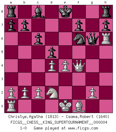 Last move : 1-0 2018 December 27 15:54:8 [Event "FICGS__CHESS__KING_SUPERTOURNAMENT__000004"] [Site "FICGS"] [Date "2018.12.16"] [Round "1"] [White "Christye,Agatha"] [Black "Csoma,Robert"] [Result "1-0"] [WhiteElo "1813"] [BlackElo "1640"] 1.e4 e5 2.f4 exf4 3.Nf3 g5 4.h4 Be7 5.hxg5 Bxg5 6.d4 d6 7.Qd3 c6 8.Nxg5 Qxg5 9.Qf3 Nf6 10.Bxf4 Qg6 11.Nd2 d5 12.Bxb8 Rxb8 13.Qf4 Ra8 14.Rh6 1-0 King's knight's gambit Player White won this chess game. Follow this game move after move (download)A strong memory, concentration, imagination, and a strong will is required to become a great Chess player. (Bobby Fischer) Mein erstes Ziel war nicht, die Partie zu gewinnen, sondern eine Figur zu opfern. -- der junge (Wilhelm Steinitz) El juego del Ajedrez no es solamente una diversión quieta; algunas cualidades muy valuables de la mente se pueden adquirir y cultivar con el, como convertirlos en habitos disponibles para toda ocasión; ya que la vida es algo así como el Ajedrez. (Benjamin Franklin) On peut tirer plus d'utilité d'une partie perdue que de 100 parties gagnées. (Capablanca) There are two major products that came out of Berkeley: LSD and UNIX. We do not believe this is to be a coincidence. (Jeremy S. Anderson)